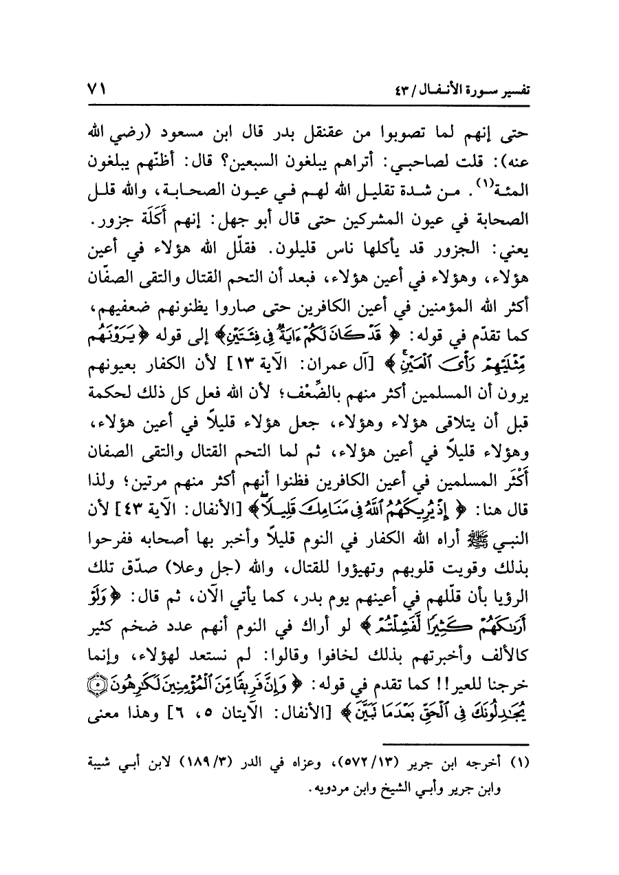 فقلّل الله هؤلاء في أعْيُنِ هؤلاء، وهؤلاء في أعين هؤلاء، فَبَعْدَ أَنِ الْتَحَمَ القِتَالُ والْتَقَى الصفّان أكثر الله المؤمنين في أعين الكافرين حتى صاروا يظنونهم ضعْفَيْهِمْ، كما تقدّم في قوله: {قَدْ كَانَ لَكُمْ آيَةٌ فِي فِئَتَيْنِ} إلى قوله: {يَرَوْنَهُم مِّثْلَيْهِمْ رَأْيَ الْعَيْنِ} [آل عمران: الآية ١٣]؛ لأن الكفار بعيونهم يَرَوْنَ أن المسلمين أكثر منهم بالضِّعْف؛ لأن الله فعل كل ذلك لحكمة قبل أن يتلاقى هؤلاء وهؤلاء، جعل هؤلاء قليلاً في أعين هؤلاء، وهؤلاء قليلاً في أعين هؤلاء، ثم لما الْتَحَمَ القتال والتقى الصفان أَكْثَر المسلمين في أعين الكافرين فظنوا أنهم أكثر منهم مرتين؛ ولذا قال هنا: {إِذْ يُرِيكَهُمُ اللَّهُ فِي مَنَامِكَ قَلِيلاً} [الأنفال: الآية ٤٣] لأن النبي صلى الله عليه وسلم أراه الله الكفار في النوم قليلاً وأخْبَرَ بها أصحابه ففَرِحُوا بذلك وقويت قلوبهم وتهيئوا للقتال، والله (جل وعلا) صدّق تلك الرؤيا بأن قلَّلَهُم في أعينهم يوم بدر، كما يأتي الآن، ثم قال: {وَلَوْ أَرَاكَهُمْ كَثِيراً لَّفَشِلْتُمْ} لو أراك في النوم أنهم عدد ضخم كثير كالألف وأخبرتهم بذلك لخافوا وقالوا: لم نستعد لهؤلاء، وإنما خرجنا للعير!! كما تقدم في قوله: {وَإِنَّ فَرِيقاً مِّنَ الْمُؤْمِنِينَ لَكَارِهُونَ (٥) يُجَادِلُونَكَ فِي الْحَقِّ بَعْدَمَا تَبَيَّنَ} [الأنفال: الآيتان ٥، ٦] وهذا معنى