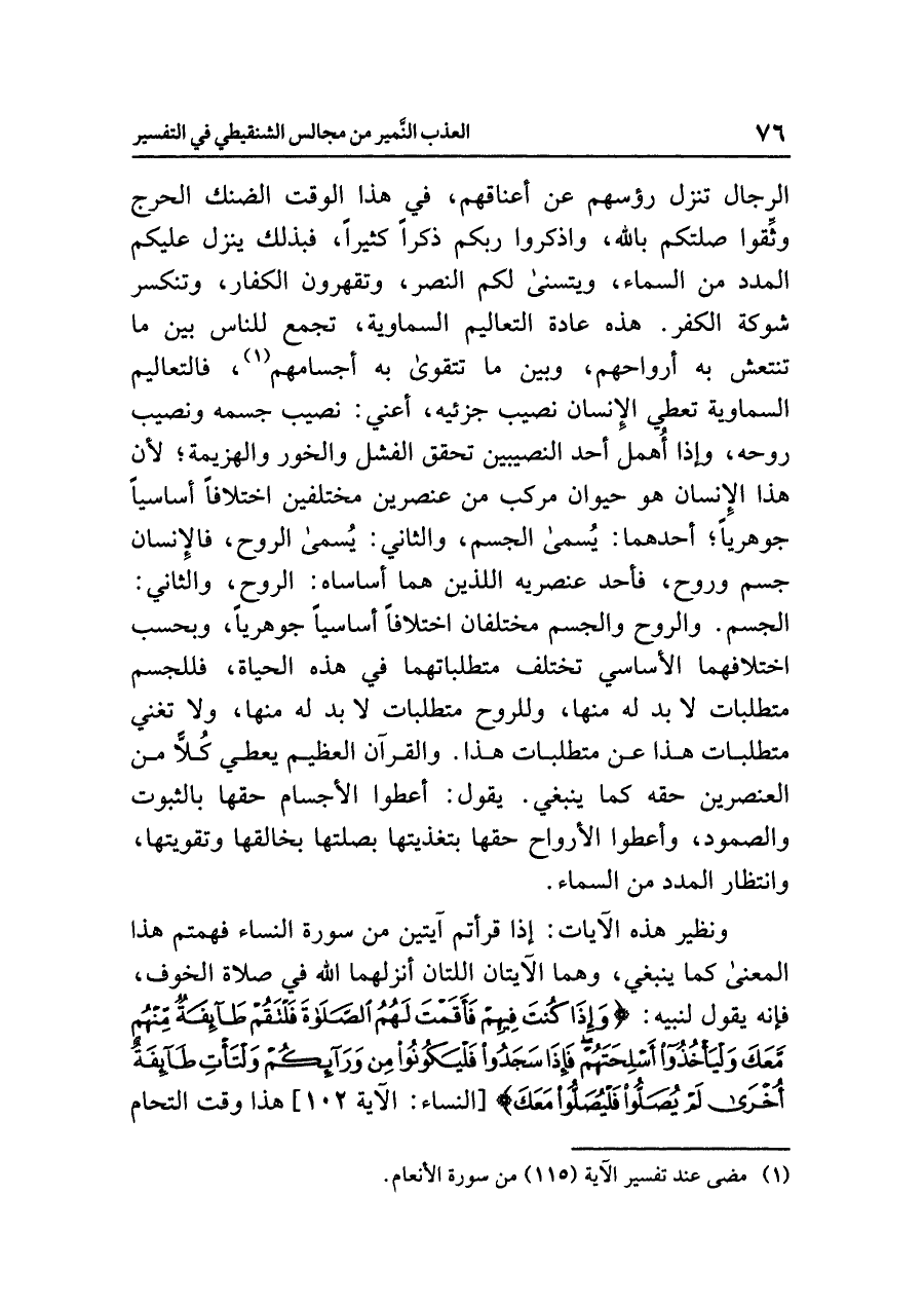 ونظير هذه الآيات: إذا قرأتم آيتين من سورة النساء فَهِمْتُمْ هذا المعنى كما ينبغي، وهما الآيتان اللتان أنزلهما الله في صلاة الخوف، فإنه يقول لنبيه: {وَإِذَا كُنتَ فِيهِمْ فَأَقَمْتَ لَهُمُ الصَّلَاةَ فَلْتَقُمْ طَآئِفَةٌ مِّنْهُم مَّعَكَ وَلْيَأْخُذُواْ أَسْلِحَتَهُمْ فَإِذَا سَجَدُواْ فَلْيَكُونُواْ مِن وَرَآئِكُمْ وَلْتَأْتِ طَآئِفَةٌ أُخْرَى لَمْ يُصَلُّواْ فَلْيُصَلُّواْ مَعَكَ} [النساء: الآية ١٠٢] هذا وقت الْتِحَام
