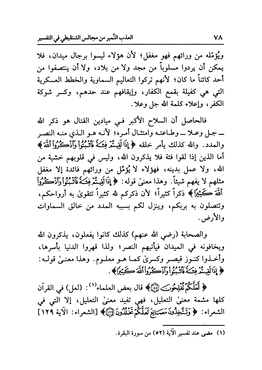 فالحاصل أن السلاح الأكبر في ميادين القتال هو ذكر الله -جل وعلا- وطاعته وامتثال أمره؛ لأنه هو الذي منه النَّصْر والمَدَد. والله كذلك يأمر خلقه {إِذَا لَقِيتُمْ فِئَةً فَاثْبُتُواْ وَاذْكُرُواْ اللَّهَ} أما الذين إذا لقوا فِئَة فلا يذكرون الله، وليس في قلوبهم خشية من الله، ولا عمل بدينه، فهؤلاء لا يُؤمّل من ورائهم فائدة إلا مغفل مثلهم لا يفهم شيئاً. وهذا معنى قوله: {إِذَا لَقِيتُمْ فِئَةً فَاثْبُتُواْ وَاذْكُرُواْ اللهَ كَثِيراً} ذكرًا كثيرًا؛ لأن ذكركم لله كثيرًا تتقوى به أرواحكم، وتتصلون به بربكم، وينزل لكم بسببه المدد من خالق السماوات والأرض.