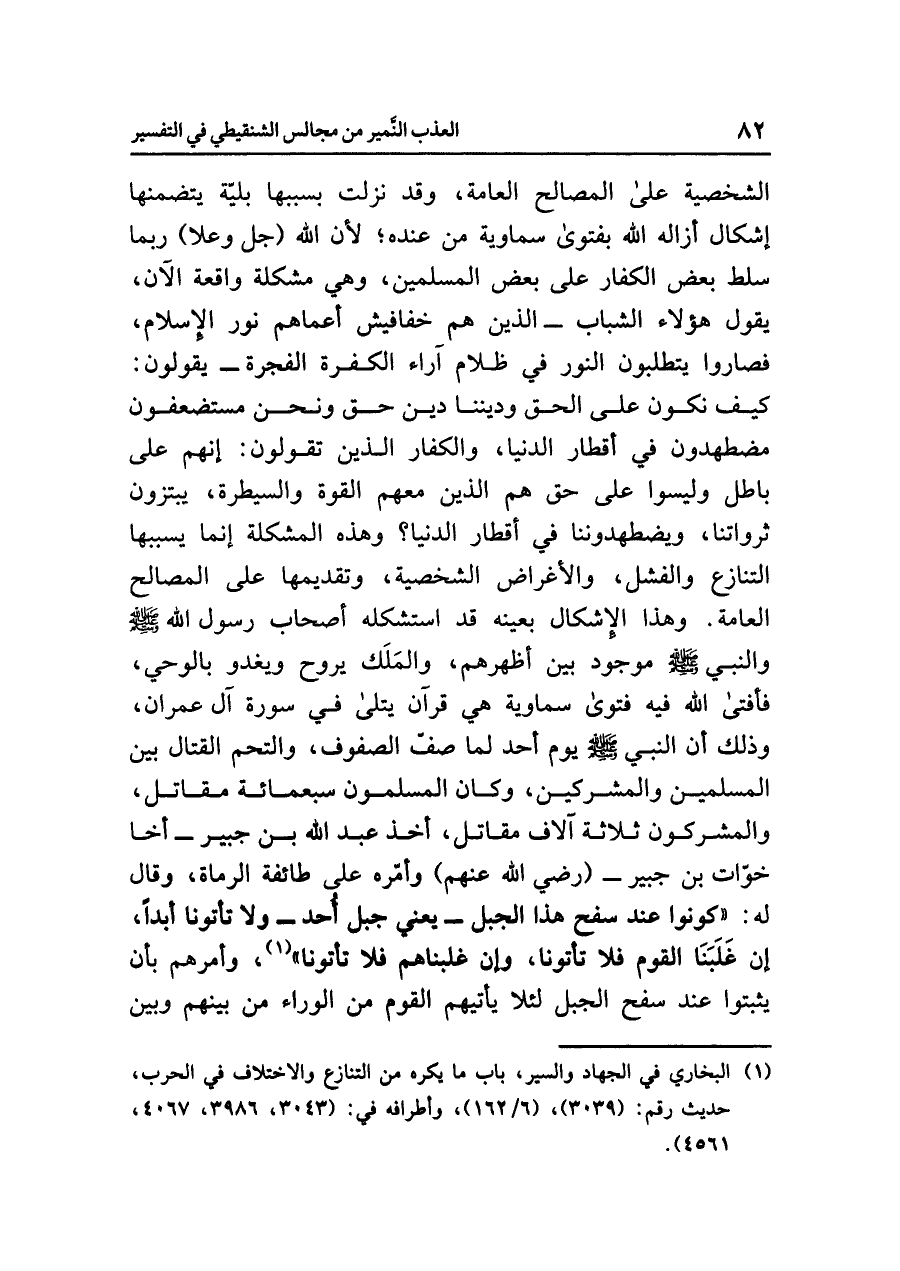 الشخصية على المصالح العامة، وقد نزلت بسببها بليّة يتضمنها إشكال أزاله الله بفتوى سماوية من عنده؛ لأن الله (جل وعلا) ربما سَلَّطَ بعض الكفار على بعض المسلمين، وهي مشكلة واقعة الآن، يقول هؤلاء الشباب -الذين هم خفافيش أعماهم نور الإسلام، فصاروا يتطلبون النور في ظلام آراء الكفرة الفجرة- يقولون: كيف نكون على الحق وديننا دين حق ونحن مستضعفون مضطهدون في أقطار الدنيا، والكفار الذين تقولون: إنهم على باطل وليسوا على حق هم الذين معهم القوة والسيطرة، يبتزّون ثَرَوَاتِنا، ويضطهدوننا في أقطار الدنيا؟! وهذه المشكلة إنما يسببها التنازع والفَشَل، والأغراض الشخصية، وتقديمها على المصالح العامة. وهذا الإشكال بعينه قد اسْتَشْكَلَهُ أصْحَاب رَسُول الله صلى الله عليه وسلم والنبي صلى الله عليه وسلم موجود بين أظْهُرِهِمْ، والمَلَك يروح ويغدو بالوحي، فأفتى الله فيه فتوى سماوية هي قرآن يُتْلَى في سورة آل عمران، وذلك أن النبي صلى الله عليه وسلم يَوْمَ أحُد لما صفَّ الصفوف، والتحم القتال بين المسلمين والمشركين، وكان المسلمون سبعمائة مقاتل، والمشركون ثلاثة آلاف مقاتل، أخذ عبد الله بن جبير -أخا خوّات بن جبير- (رضي الله عنهم) وأمّره على طائفة الرماة، وقال له: «كُونُوا عِنْدَ سَفْحِ هَذَا الجَبَلِ -يعني جبل أُحد- وَلَا تَأْتُونَا أَبَداً، إِنْ غَلَبَنَا الْقَوْمُ فَلَا تَأْتُونَا، وَإِنْ غَلَبْنَاهُمْ فَلَا تَأْتُونَا» (¬١)،