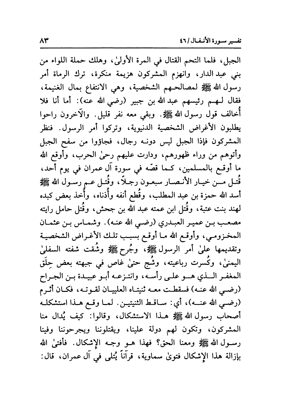 الجبل، فلما الْتَحَمَ القِتَالُ في المرة الأولى، وهلك حملة اللواء مِنْ بَنِي عَبْدِ الدَّارِ، وانهزم المشركون هزيمة منكرة، ترك الرماة أمر رَسُول الله صلى الله عليه وسلم لمصالحهم الشخصية، وهي الانتفاع بمال الغنيمة، فقال لهم رئيسهم عبد الله بن جبير (رضي الله عنه): أما أنا فلا أخالف قول رَسُول الله صلى الله عليه وسلم. وبقي معه نَفَرٌ قَلِيل. والآخرون راحوا يطلبون الأغراض الشخصية الدنيوية، وتَرَكُوا أمْرَ الرَّسُول. فنَظَرَ المُشْرِكُونَ فَإِذا الجَبَلُ ليس دونه رجال، فجاءوا مِنْ سَفْحِ الجَبَلِ وأتوهم مِنْ وَرَاءِ ظهورهم، ودارت عليهم رَحَى الحرب، وأوقع الله ما أوقع بالمسلمين، كما قَصَّهُ في سورة آل عمران في يوم أحد، قُتل مِنْ خِيَارِ الأنْصَار سبعون رجلاً، وقُتل عَمّ رَسُول الله صلى الله عليه وسلم أسَد الله حمزة بن عبد المطلب، وقُطِعَ أنْفُهُ وأذُناه، وأُخذ بعض كبده لهِنْد بِنْت عُتْبة، وقُتِلَ ابْنُ عمته عبد الله بن جحش، وقتل حامل رايته مُصْعَب بن عمير العَبْدَرِي (رضي الله عنه). وشَمَّاس بن عثمان المخْزُومِيّ، وأوقع الله ما أوْقَع بسبب تلك الأغراض الشخْصيَّة وتقديمها على أمر الرسول صلى الله عليه وسلم، وجُرح صلى الله عليه وسلم وشُقَّت شَفَتُهُ السُّفْلَى اليُمْنَى، وكُسِرَتْ رَبَاعيَّته، وشُجَّ حتى غَاص في جَبْهَتِهِ بعض حِلَق المغفر الذي هو على رأسه، وانْتَزَعَهُ أبو عبيدة بن الجراح (رضي الله عنه) فسقطت معه ثنيتاه العلييان لقوته، فكان أثرم (رضي الله عنه)، أي: ساقط الثنيتين. لما وقع هذا استشكله أصحاب رَسُول الله صلى الله عليه وسلم هذا الاستشكال، وقالوا: كيف يُدال منا المُشْرِكُون، وتكون لهم دولة عَلَيْنَا، ويقتلوننا ويجْرَحُونَنا وفِينَا رَسُول الله صلى الله عليه وسلم ومعنا الحَق؟ فهذا هو وجه الإشكال.