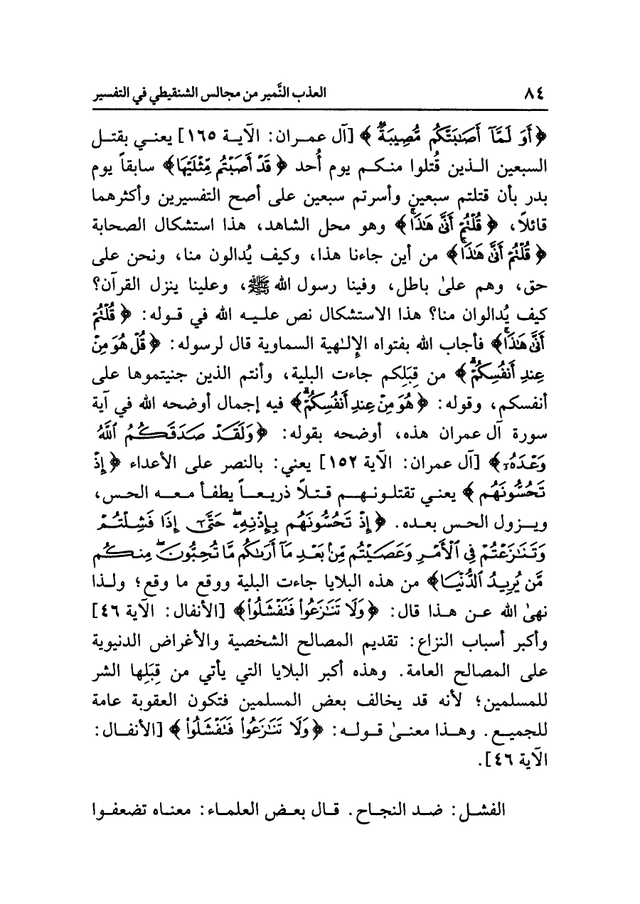 {أَوَلَمَّا أَصَابَتْكُم مُّصِيبَةٌ} [آل عمران: الآية ١٦٥] يعني بقتل السَّبْعِين الذين قُتلوا منكم يوم أُحُد {قَدْ أَصَبْتُم مِّثْلَيْهَا} سابقاً يوم بدر بأن قتلتم سبعين وأسَرْتُمْ سَبْعِين على أصَحِّ التَّفْسِيرَيْنِ وأكثرهما قائلاً، {قُلْتُمْ أَنَّى هَذَا} وهو محل الشاهد، هذا استشكال الصحابة {قُلْتُمْ أَنَّى هَذَا} مِنْ أَيْنَ جَاءَنَا هَذا، وكيف يُدالون مِنَّا، ونحن على حق، وهم على باطل، وفينا رَسُول الله صلى الله عليه وسلم، وعلينا ينزل القرآن؟ كيف يُدالون منا؟ هذا الاستشكال نص عليه الله في قوله: {قُلْتُمْ أَنَّى هَذَا} فأجاب الله بفتواه الإلهية السماوية قال لرسوله: {قُلْ هُوَ مِنْ عِندِ أَنْفُسِكُمْ} من قِبَلكم جاءت البَلِيَّة، وأنْتُم الَّذِين جنيتموها على أنفسكم، وقوله: {هُوَ مِنْ عِندِ أَنْفُسِكُمْ} فيه إجمال أوْضَحَهُ الله في آية سورة آل عمران هذه، أوْضَحه بقوله: {وَلَقَدْ صَدَقَكُمُ اللهُ وَعْدَهُ} [آل عمران: الآية ١٥٢] يعني: بالنصر على الأعداء {إِذْ تَحُسُّونَهُم} يعني تقتلونهم قتلاً ذَرِيعاً يُطفأ معه الحس، ويزول الحس بعده {إِذْ تَحُسُّونَهُم بِإِذْنِهِ حَتَّى إِذَا فَشِلْتُمْ وَتَنَازَعْتُمْ فِي الأَمْرِ وَعَصَيْتُم مِّن بَعْدِ مَا أَرَاكُم مَّا تُحِبُّونَ مِنكُم مَّن يُرِيدُ الدُّنْيَا} من هذه البلايا جاءت البلية ووقع ما وقع؛ ولذا نهى الله عن هذا قال: {وَلَا تَنَازَعُواْ فَتَفْشَلُواْ} [الأنفال: الآية ٤٦] وأكبر أسباب النِّزَاع: تقديم المصالح الشخصية والأغراض الدنيوية على المصالح العامة. وهذه أكبر البلايا التي يَأْتِي من قِبَلِها الشر للمسلمين؛ لأنه قد يخالف بعض المسلمين فتكون العقوبة عامة للجَمِيع. وهذا معنى قوله: {وَلَا تَنَازَعُواْ فَتَفْشَلُواْ} [الأنفال: الآية ٤٦].