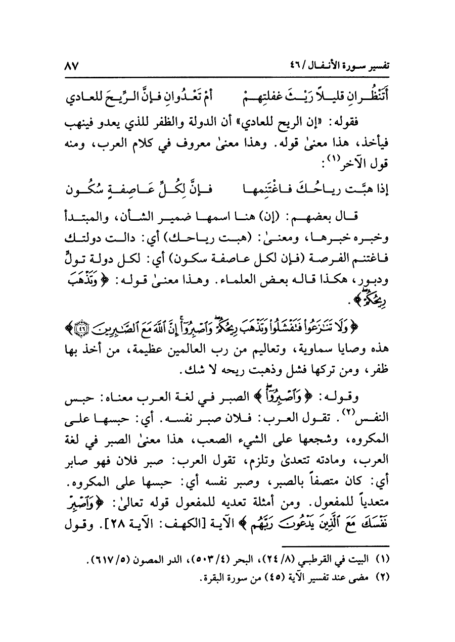 وقوله: {وَاصْبِرُواْ} الصبر في لغة العرب معناه: حبس النفس (¬٢). تقول العرب: فلان صبر نفسه. أي: حبسها على المكروه، وشجعها على الشيء الصعب، هذا معنى الصبر في لغة العرب، ومادته تتعدى وتلزم، تقول العرب: صبر فلان فهو صابر أي: كان متصفاً بالصبر، وصبر نفسه؛ أي: حبسها على المكروه. متعدياً للمفعول. ومن أمثلة تعديه للمفعول قوله تعالى: {وَاصْبِرْ نَفْسَكَ مَعَ الَّذِينَ يَدْعُونَ رَبَّهُم ... } الآية [الكهف: الآية ٢٨]. وقول