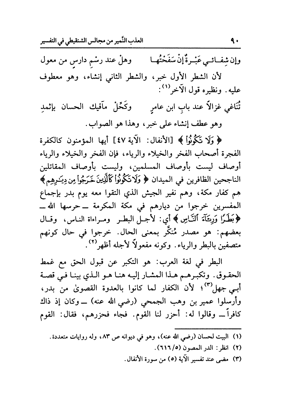 البطر في لغة العرب: هو التكبر عن قبول الحق مع غَمْطِ الحقوق. وتكبرهم هذا المشار إليه هنا هو الذي بَيَّنَّا في قصة أبي جهل (¬٣)؛ لأن الكفار لما كانوا بالعدوة القصوى من بدر، وأرسلوا عمير بن وهب الجمحي (رضي الله عنه) -وكان إذ ذاك كافرًا- وقالوا له: احزر لنا القوم. فجاء فحزرهم، فقال: القوم