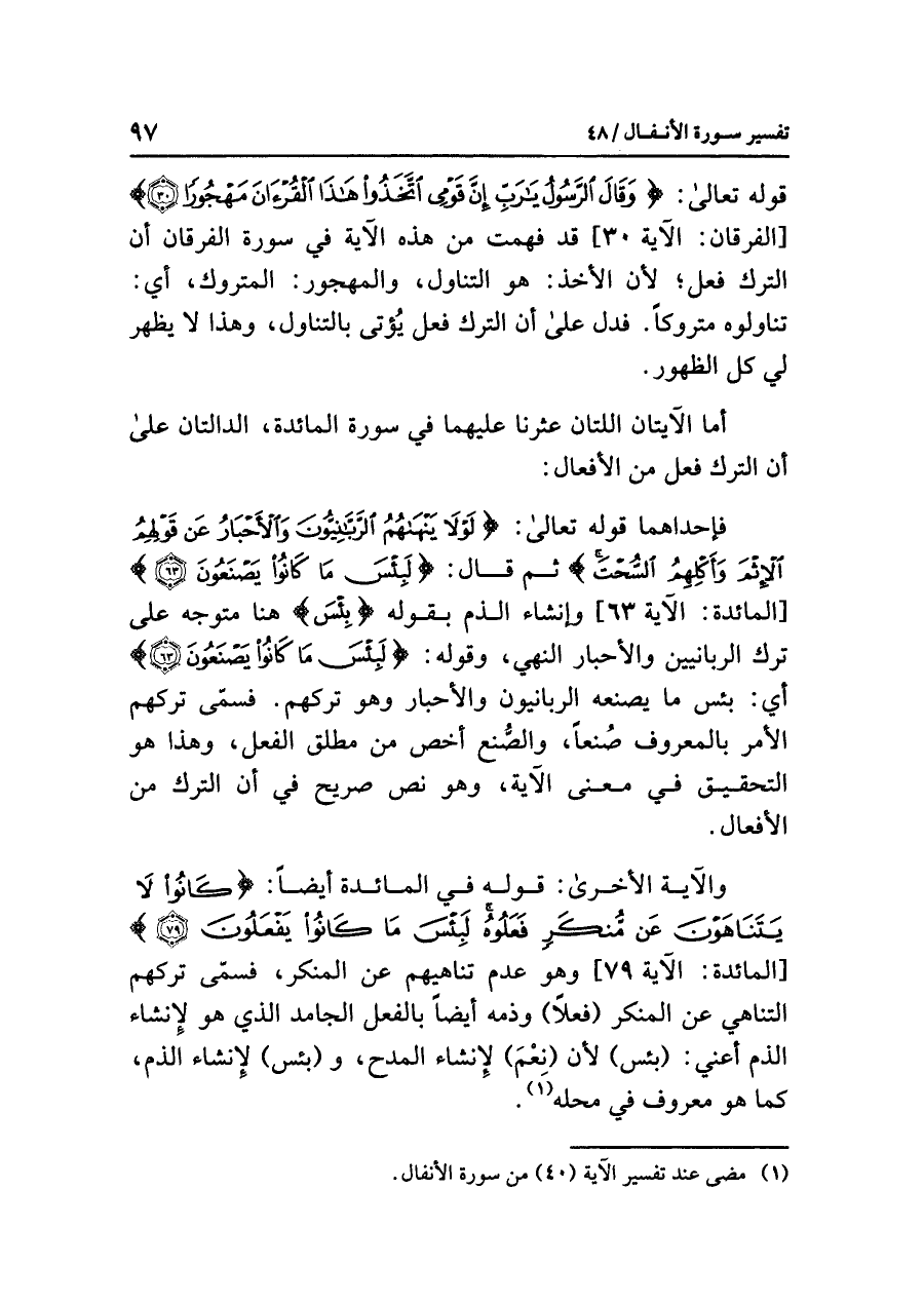 فإحداهما قوله تعالى: {لَوْلَا يَنْهَاهُمُ الرَّبَّانِيُّونَ وَالأَحْبَارُ عَن قَوْلِهِمُ الإِثْمَ وَأَكْلِهِمُ السُّحْتَ} ثم قال: {لَبِئْسَ مَا كَانُواْ يَصْنَعُونَ} [المائدة: الآية ٦٣] إنشاء الذم بقوله {بِئْسَ} هنا متوجه على ترك الربانيين والأحبار النهي، وقوله: {لَبِئْسَ مَا كَانُواْ يَصْنَعُونَ} أي: بئس ما يصنعه الربانيُّونَ والأحْبَار وهو تركهم. فسمّى تركهم الأمر بالمعروف صنعاً، والصُّنع أخَصّ من مُطْلَقِ الفِعْلِ، وهذا هو التحقيق في معنى الآية، وهو نص صريح في أن الترك من الأفعال.