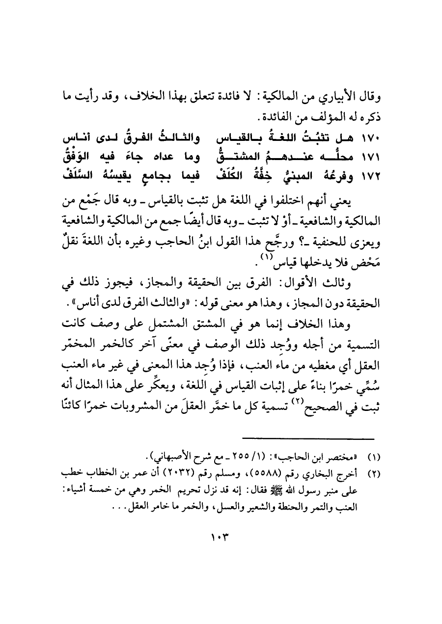 يعني أنهم اختلفوا في اللغة هل تثبت بالقياس -وبه قال جَمْع من المالكية والشافعية- أوْ لا تثبت -وبه قال أيضًا جمع من المالكية والشافعية ويعزى للحنفية-؟ ورجَّح هذا القول ابنُ الحاجب وغيره بأن اللغةَ نقلٌ مَحْض فلا يدخلها قياس (¬١).