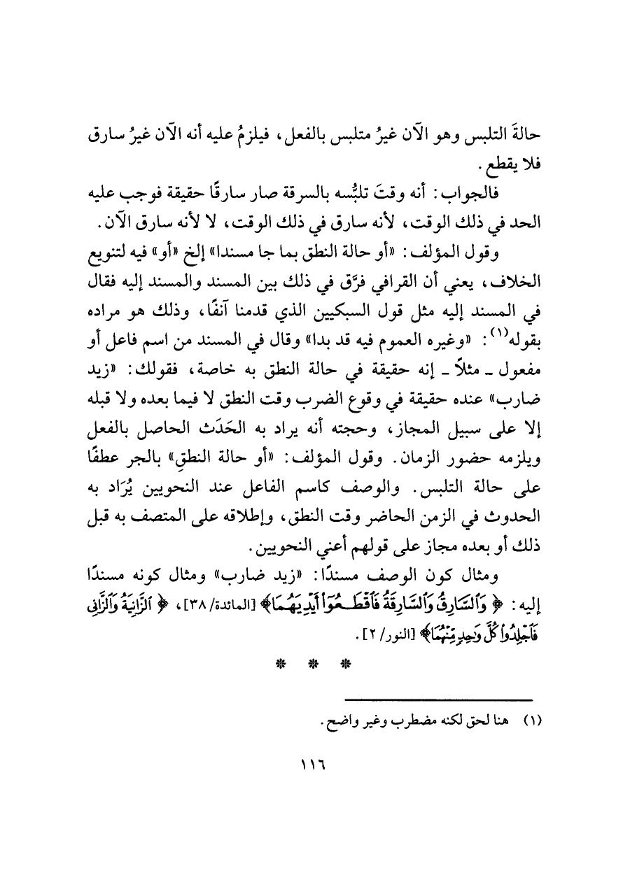 وقول المؤلف: "أو حالة النطق بما جا مسندا" إلخ "أو" فيه لتنويع الخلاف، يعني أن القرافي فرَّق في ذلك بين المسند والمسند إليه فقال في المسند إليه مثل قول السبكيين الذي قدمنا آنفًا، وذلك هو مراده بقوله (¬١): "وغيره العموم فيه قد بدا" وقال في المسند من اسم فاعل أو مفعول -مثلًا- إنه حقيقة في حالة النطق به خاصة، فقولك: "زيد ضارب" عنده حقيقة في وقوع الضرب وقت النطق لا فيما بعده ولا قبله إلا على سبيل المجاز، وحجته أنه يراد به الحَدَث الحاصل بالفعل ويلزمه حضور الزمان. وقول المؤلف: "أو حالة النطقِ" بالجر عطفًا على حالة التلبس. والوصف كاسم الفاعل عند النحويين يُرَاد به الحدوث في الزمن الحاضر وقت النطق، وإطلاقه على المتصف به قبل ذلك أو بعده مجاز على قولهم أعني النحويين.