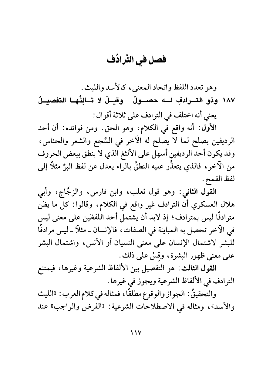 ١٨٧ - وذو الترادفِ له حصولُ ... وقيلَ لا ثالِثُها التفصيلُ