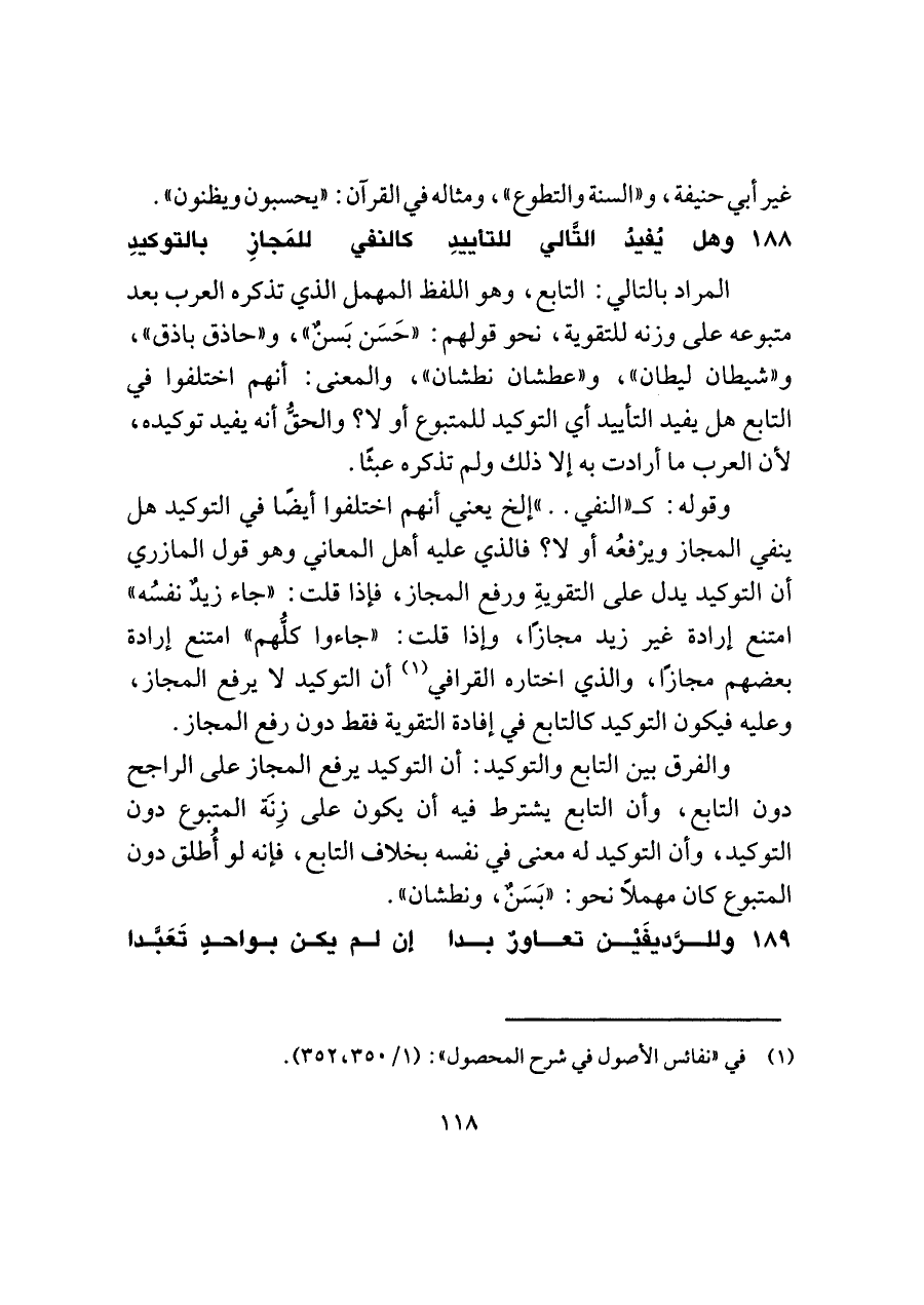 وقوله: كـ "النفي. . " إلخ يعني أنهم اختلفوا أيضًا في التوكيد هل ينفي المجاز ويرْفعُه أو لا؟ فالذي عليه أهل المعاني وهو قول المازري أن التوكيد يدل على التقويةِ ورفع المجاز، فإذا قلت: "جاء زيدٌ نفسُه" امتنع إرادة غير زيد مجازًا، وإذا قلت: "جاءوا كلُّهم" امتنع إرادة بعضهم مجازًا، والذي اختاره القرافي (¬١) أن التوكيد لا يرفع المجاز، وعليه فيكون التوكيد كالتابع في إفادة التقوية فقط دون رفع المجاز.