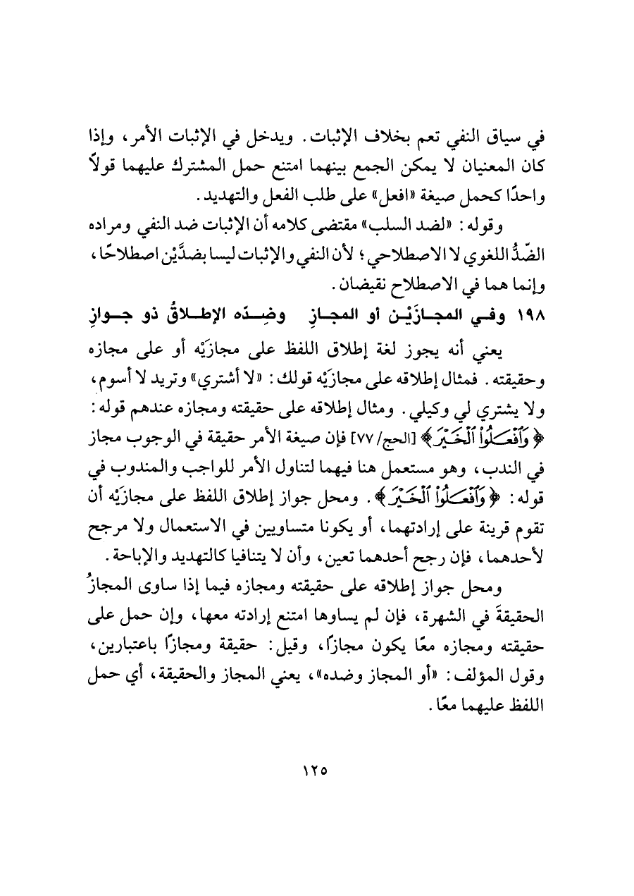 ١٩٨ - وفي المجازَيْن أو المجازِ ... وضِدّه الإطلاقُ ذو جوازِ