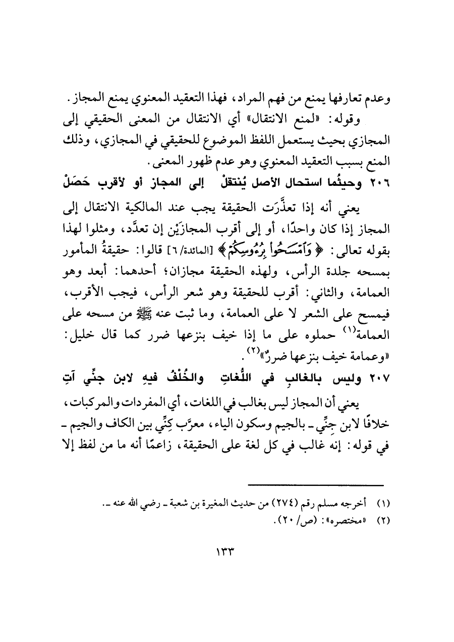 يعني أنه إذا تعذَّرَت الحقيقة يجب عند المالكية الانتقال إلى المجاز إذا كان واحدًا، أو إلى أقرب المجازَيْن إن تعدَّد، ومثلوا لهذا بقوله تعالى: {وَامْسَحُوا بِرُءُوسِكُمْ} [المائدة/ ٦] قالوا: حقيقةُ المأمور بمسحه جلدة الرأس ولهذه الحقيقة مجازان؛ أحدهما: أبعد وهو العمامة، والثاني: أقرب للحقيقة وهو شعر الرأس، فيجب الأقرب، فيمسح على الشعر لا على العمامة، وما ثبت عنه -صلى اللَّه عليه وسلم- من مسحه على العمامة (¬١) حملوه على ما إذا خيف بنزعها ضرر كما قال خليل: "وعمامة خيف بنزعها ضررٌ" (¬٢).