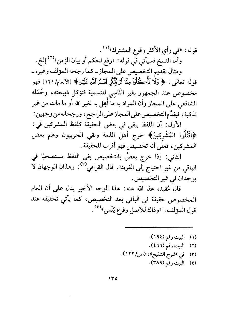 ومثال تقديم التخصيص على المجاز -كما رجحه المؤلف وغيره- قوله تعالى: {وَلَا تَأْكُلُوا مِمَّا لَمْ يُذْكَرِ اسْمُ اللَّهِ عَلَيْهِ} [الأنعام/ ١٢١] فهو مخصوص عند الجمهور بغير النَّاسِي للتسمية فتؤكل ذبيحته، وحَمَله الشافعي على المجاز وأن المراد به ما أُهِل به لغير اللَّه أو ما مات من غير تذكية، فيقدَّم التخصيص على المجاز على الراجح، ورجحانه من وجهين: