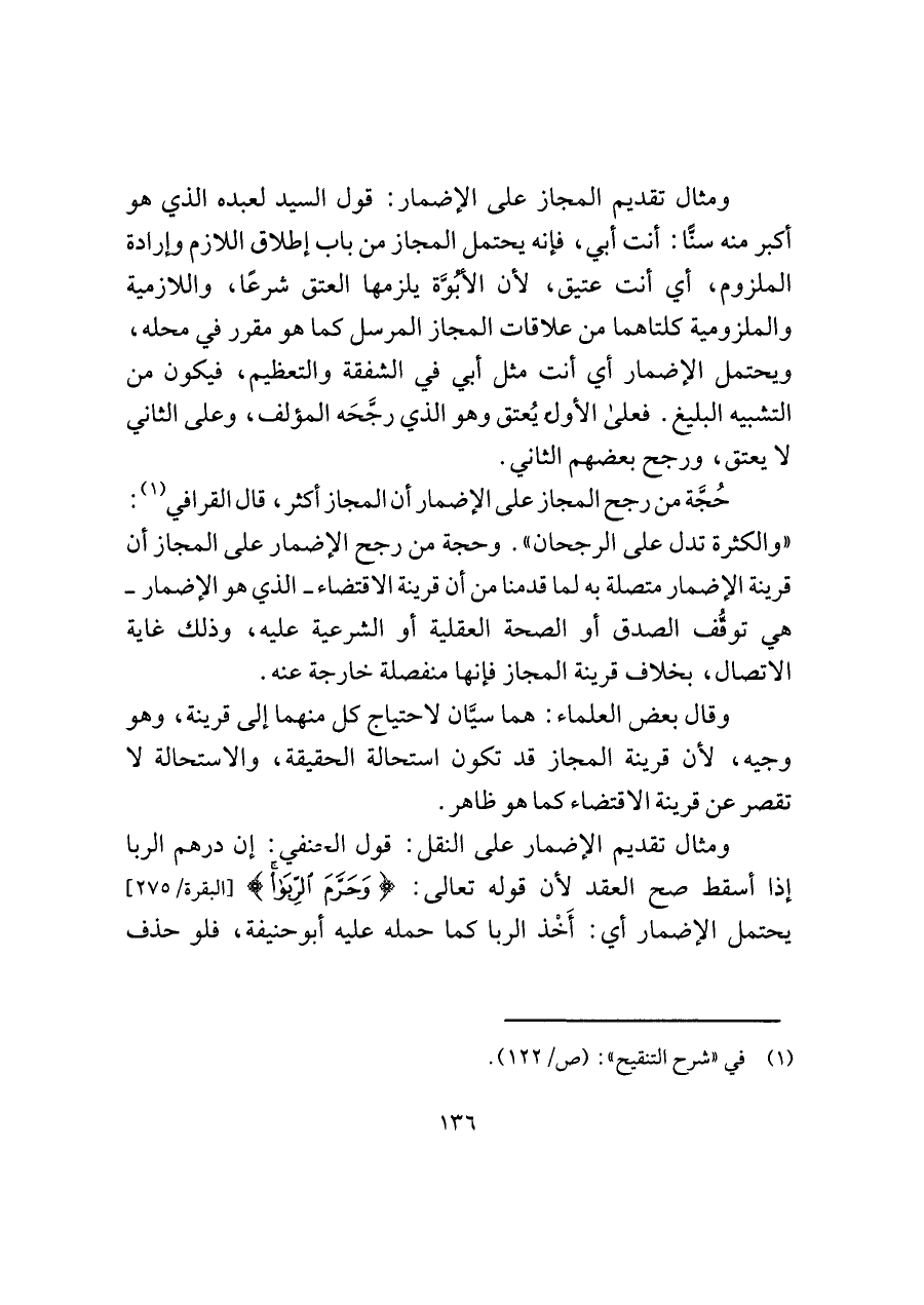 حُجَّة من رجح المجاز على الإضمار أن المجاز أكثر، قال القرافي (¬١): "والكثرة تدل على الرجحان". وحجة من رجح الإضمار على المجاز أن قرينة الإضمار متصلة به لما قدمنا من أن قرينة الاقتضاء -الذي هو الإضمار- هي توقُّف الصدق أو الصحة العقلية أو الشرعية عليه، وذلك غاية الاتصال، بخلاف قرينة المجاز فإنها منفصلة خارجة عنه.