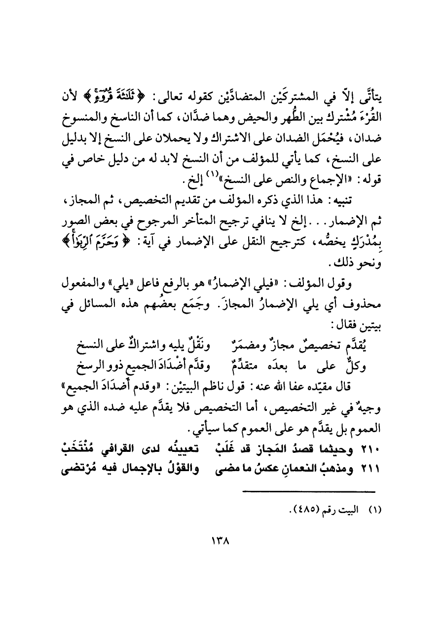 يتأتَّى إلّا في المشتركيْن المتضادَّيْن كقوله تعالى: {ثَلَاثَةَ قُرُوءٍ} لأن القُرْءَ مُشْترك بين الطُّهر والحيض وهما ضدَّان، كما أن الناسخ والمنسوخ ضدان، فيُحْمَل الضدان على الاشتراك ولا يحملان على النسخ إلا بدليل على النسخ، كما يأتي للمؤلف من أن النسخ لا بد له من دليل خاص في قوله: "الإجماع والنص على النسخ" (¬١) إلخ.