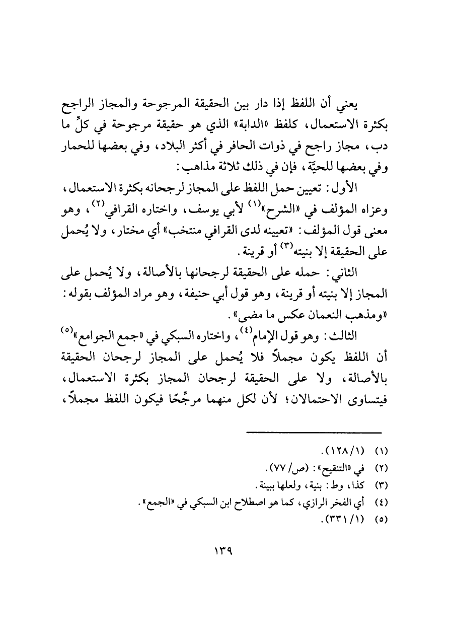 يعني أن اللفظ إذا دار بين الحقيقة المرجوحة والمجاز الراجح بكثرة الاستعمال، كلفظ "الدابة" الذي هو حقيقة مرجوحة في كلِّ ما دب، مجاز راجح في ذوات الحافر في أكثر البلاد، وفي بعضها للحمار وفي بعضها للحيَّة، فإن في ذلك ثلاثة مذاهب: