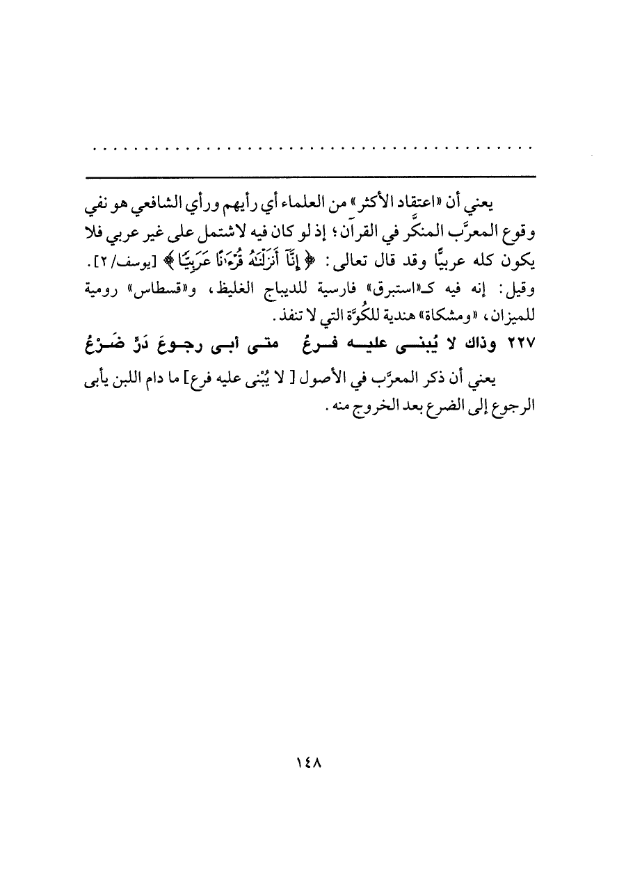 يعني أن "اعتقاد الأكثر" من العلماء أي رأيهم ورأي الشافعي هو نفي وقوع المعرَّب المنكَّر في القرآن؛ إذ لو كان فيه لاشتمل على غير عربي فلا يكون كله عربيًّا وقد قال تعالى: {إِنَّا أَنْزَلْنَاهُ قُرْآنًا عَرَبِيًّا} [يوسف/ ٢]. وقيل: إنه فيه كـ "استبرق" فارسية للديباج الغليظ، و"قسطاس" رومية للميزان، "ومشكاة" هندية للكُوَّة التي لا تنفذ.