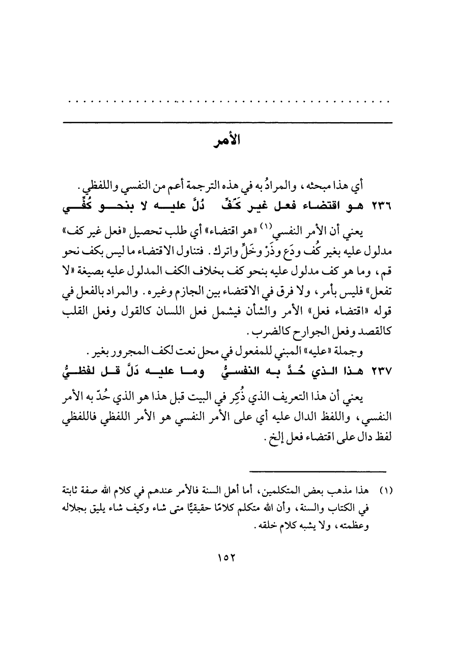 ٢٣٦ - هو اقتضاء فعل غير كَفِّ ... دُلَّ عليه لا بنحو كُفِّي