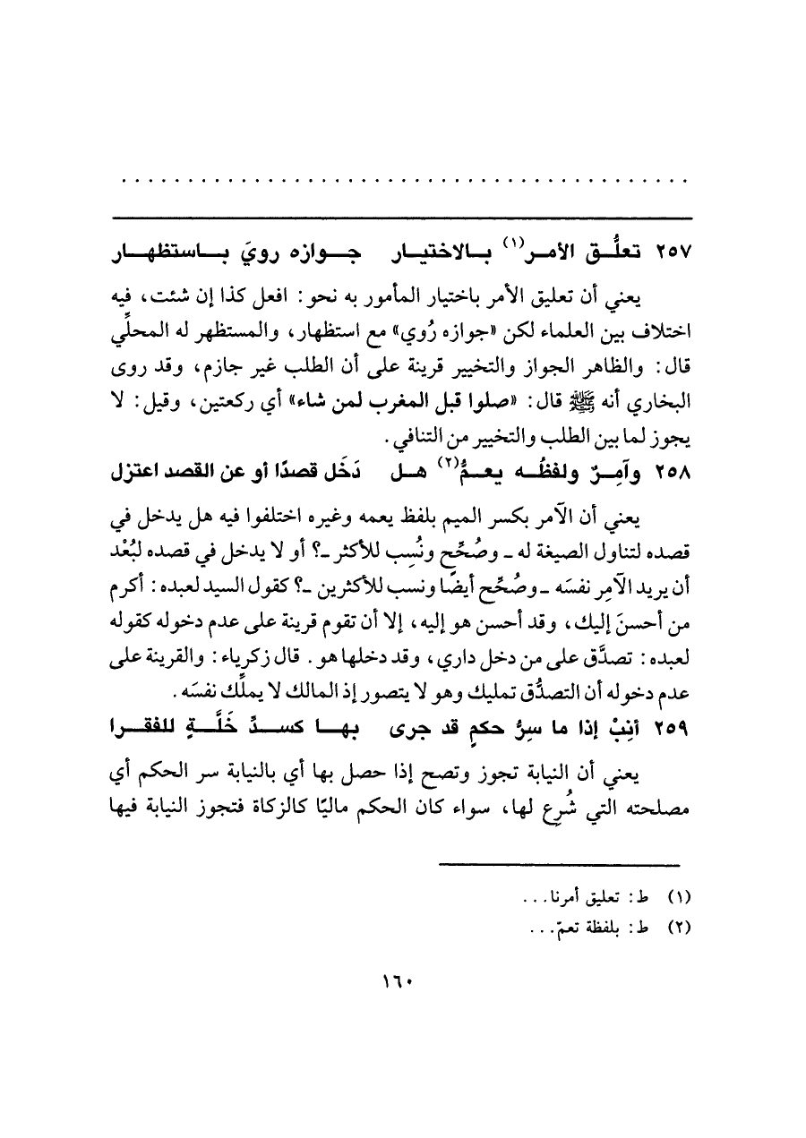 يعني أن تعليق الأمر باختيار المأمور به نحو: افعل كذا إن شئت، فيه اختلاف بين العلماء لكن "جوازه رُوي" مع استظهار، والمستظهر له المحلِّي قال: والظاهر الجواز والتخيير قرينة على أن الطلب غير جازم، وقد روى البخاري أنه -صلى اللَّه عليه وسلم- قال: "صلوا قبل المغرب لمن شاء" أي ركعتين، وقيل: لا يجوز لما بين الطلب والتخيير من التنافي.