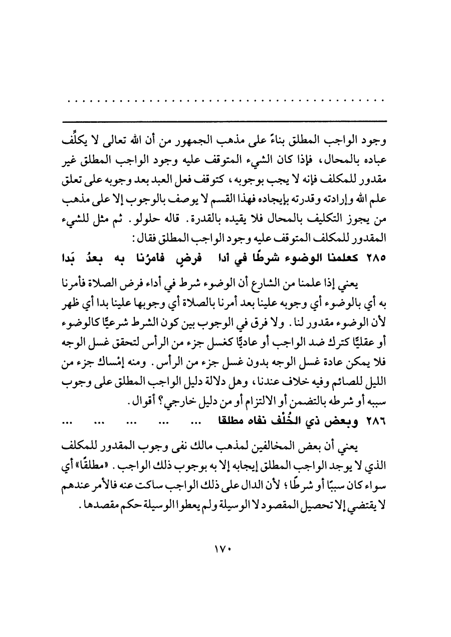 ٢٨٥ - كعلمنا الوضوء شرطًا في أدا ... فرضٍ فأمرُنا به بعدُ بَدا