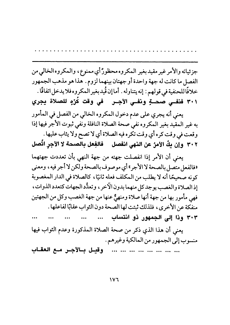 جزئياته والأمر غير مقيد بغير المكروه محظور أي ممنوع، والمكروه الخالي من الفصل ما كانت له جهة واحدة أو جهتان بينهما لزوم. هذا هو مذهب الجمهور خلافًا للحنفية في قولهم: إنه يتناوله. أما إن قُيد بغير المكروه فلا يدخل اتفاقًا.