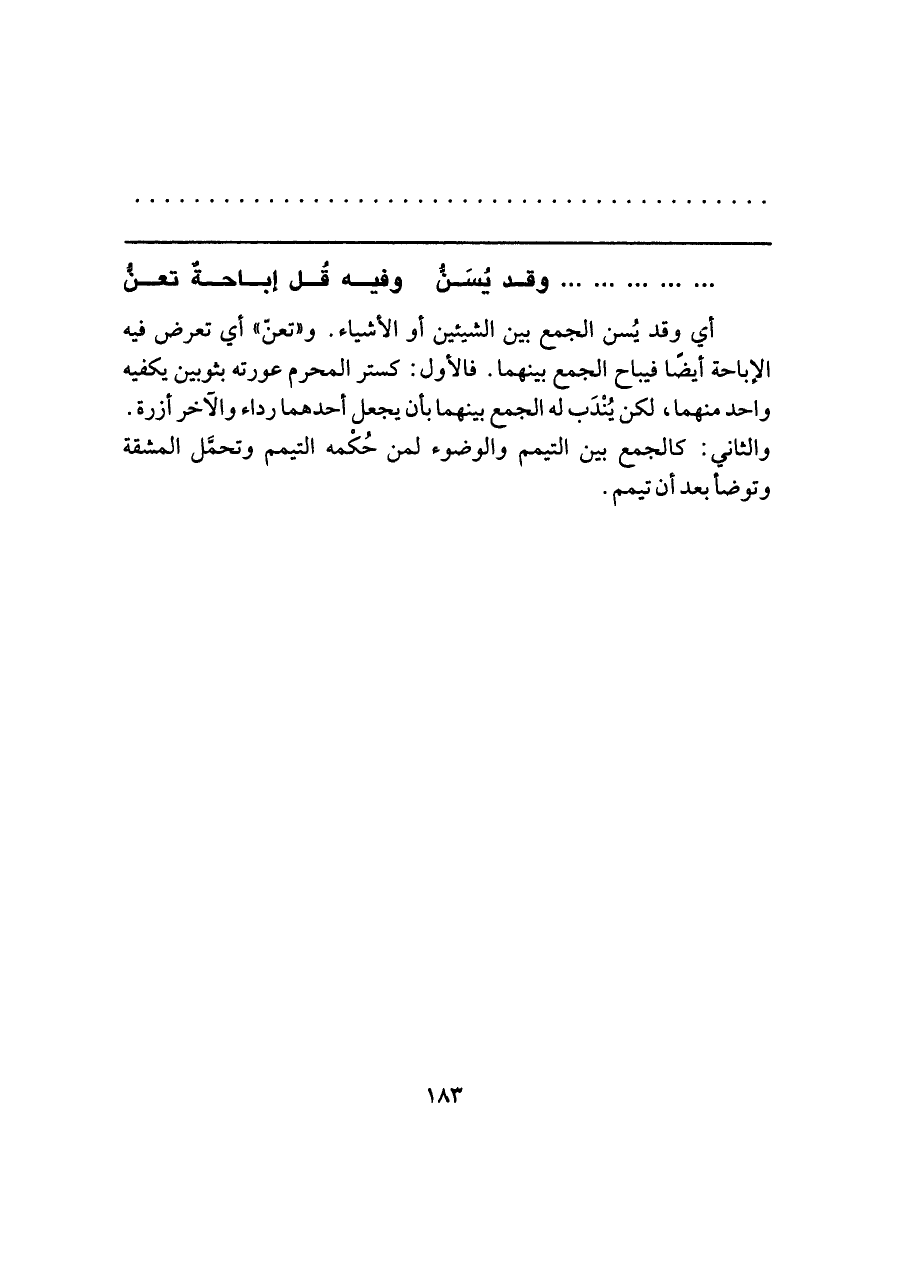 أي وقد يُسن الجمع بين الشيئين أو الأشياء. و"تعنّ" أي تعرض فيه الإباحة أيضًا فيباح الجمع بينهما. فالأول: كستر المحرم عورته بثوبين يكفيه واحد منهما، لكن يُنْدَب له الجمع بينهما بأن يجعل أحدهما رداء والآخر أزرة. والثاني: كالجمع بين التيمم والوضوء لمن حُكْمه التيمم وتحمَّل المشقة وتوضأ بعد أن تيمم.