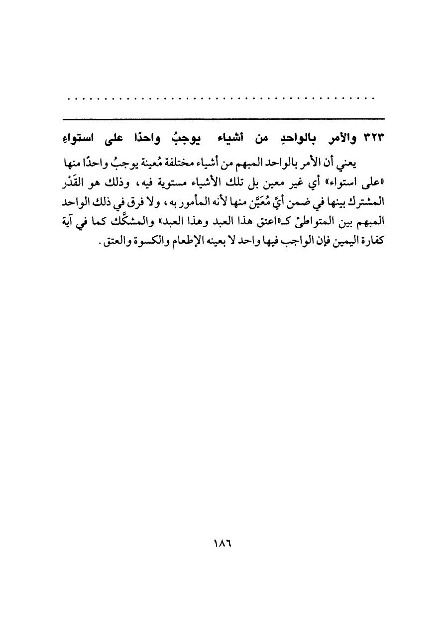 يعني أن الأمر بالواحد المبهم من أشياء مختلفة مُعينة يوجبُ واحدًا منها "على استواء" أي غير معين بل تلك الأشياء مستوية فيه، وذلك هو القَدْر المشترك بينها في ضمن أيِّ مُعَيَّن منها لأنه المأمور به، ولا فرق في ذلك الواحد المبهم بين المتواطئ كـ "اعتق هذا العبد وهذا العبد" والمشكَّك كما في آية كفارة اليمين فإن الواجب فيها واحد لا بعينه الإطعام والكسوة والعتق.
