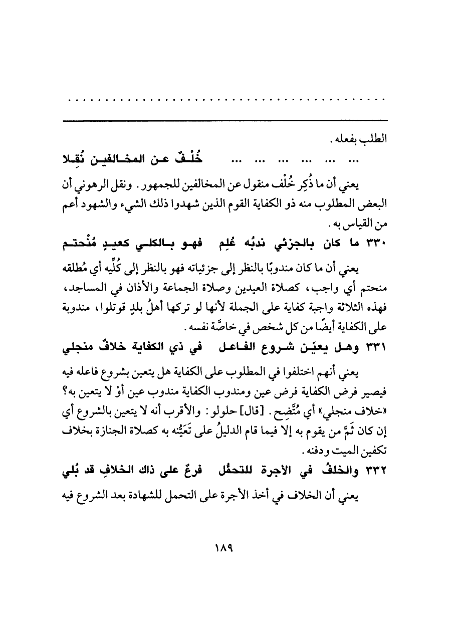 يعني أنهم اختلفوا في المطلوب على الكفاية هل يتعين بشروع فاعله فيه فيصير فرض الكفاية فرض عين ومندوب الكفاية مندوب عين أوْ لا يتعين به؟ "خلاف منجلي" أي مُتَّضِح. [قال] حلولو: والأقرب أنه لا يتعين بالشروع أي إن كان ثَمَّ من يقوم به إلا فيما قام الدليلُ على تَعَيُّنه به كصلاة الجنازة بخلاف تكفين الميت ودفنه.