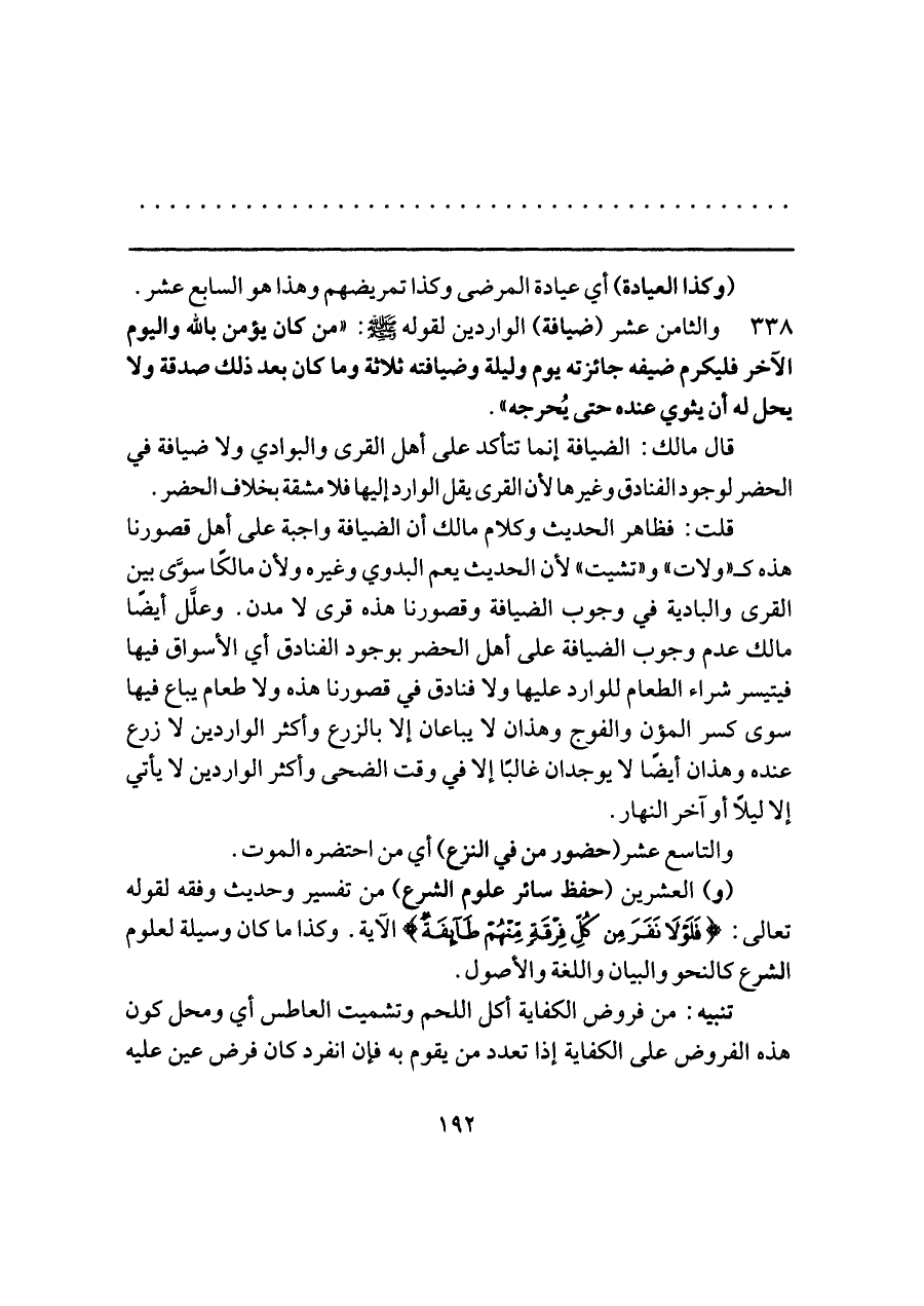 قلت: فظاهر الحديث وكلام مالك أن الضيافة واجبة على أهل قصورنا هذه كـ "ولات" و"تشيت" لأن الحديث يعم البدوي وغيره ولأن مالكًا سوَّى بين القرى والبادية في وجوب الضيافة وقصورنا هذه قرى لا مدن. وعلَّل أيضًا مالك عدم وجوب الضيافة على أهل الحضر بوجود الفنادق أي الأسواق فيها فيتيسر شراء الطعام للوارد عليها ولا فنادق في قصورنا هذه ولا طعام يباع فيها سوى كسر المؤن والفوج وهذان لا يباعان إلا بالزرع وأكثر الواردين لا زرع عنده وهذان أيضًا لا يوجدان غالبًا إلا في وقت الضحى وأكثر الواردين لا يأتي إلا ليلًا أو آخر النهار.