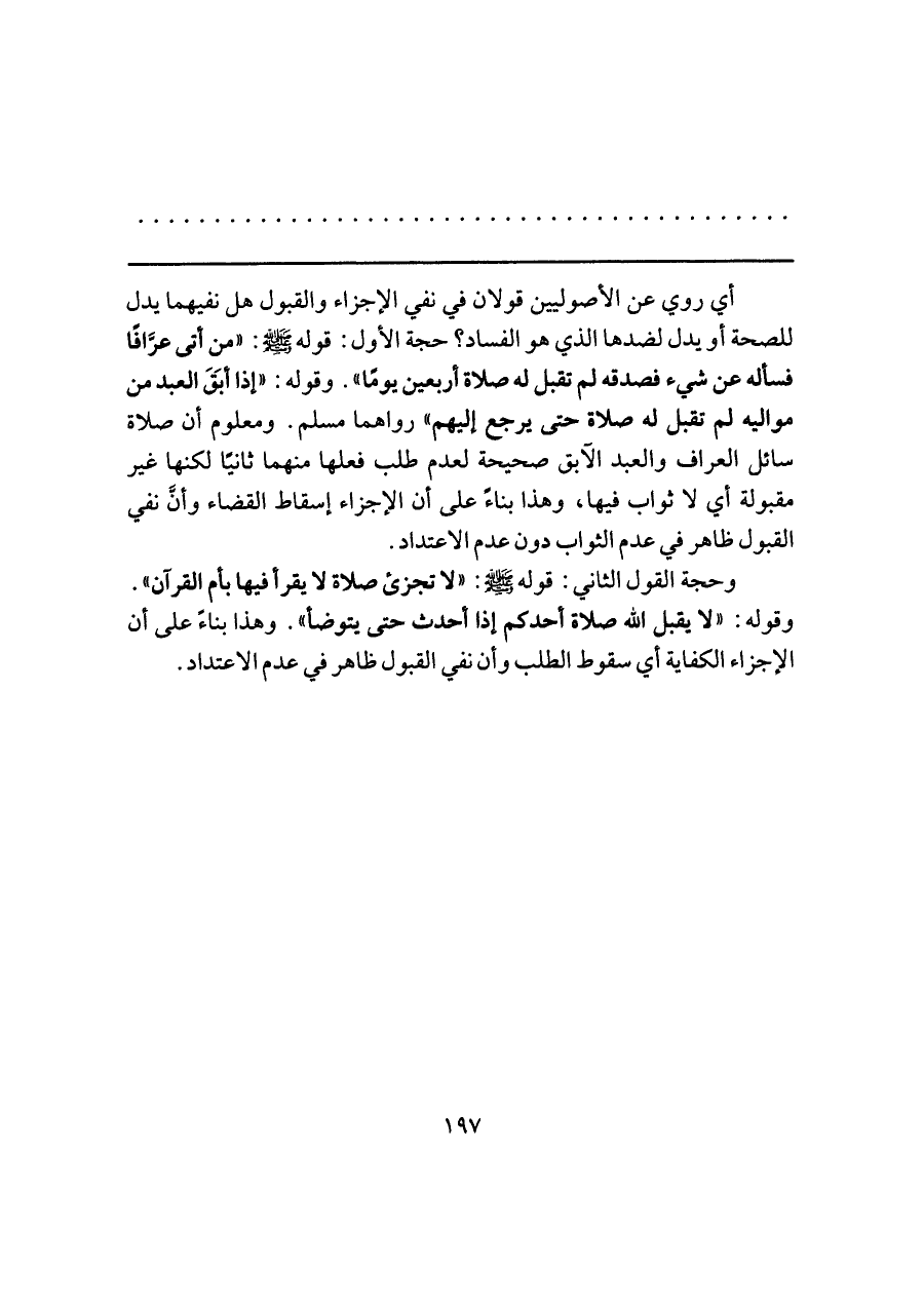 أي روي عن الأصوليين قولان في نفي الإجزاء والقبول هل نفيهما يدل للصحة أو يدل لضدها الذي هو الفساد؟ حجة الأول: قوله -صلى اللَّه عليه وسلم-: "من أتى عرَّافًا فسأله عن شيء فصدقه لم تقبل له صلاة أربعين يومًا". وقوله: "إذا أبَقَ العبد من مواليه لم تقبل له صلاة حتى يرجع إليهم" رواهما مسلم. ومعلوم أن صلاة سائل العراف والعبد الآبق صحيحة لعدم طلب فعلها منهما ثانيًا لكنها غير مقبولة أي لا ثواب فيها، وهذا بناءً على أن الإجزاء إسقاط القضاء وأنَّ نفي القبول ظاهر في عدم الثواب دون عدم الاعتداد.
