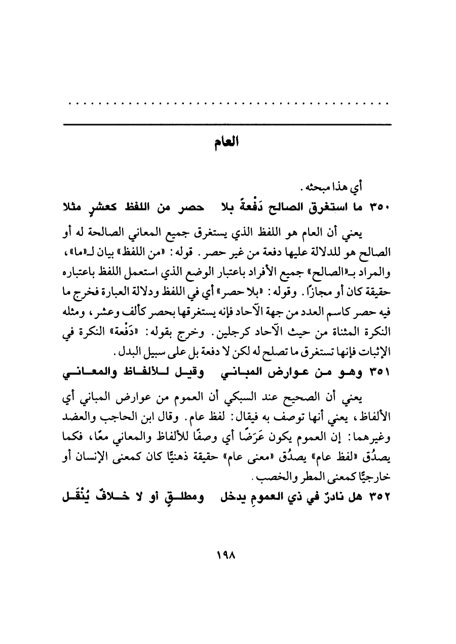 ٣٥٠ - ما استغرق الصالح دَفْعةً بلا ... حصر من اللفظ كعشرٍ مثلا