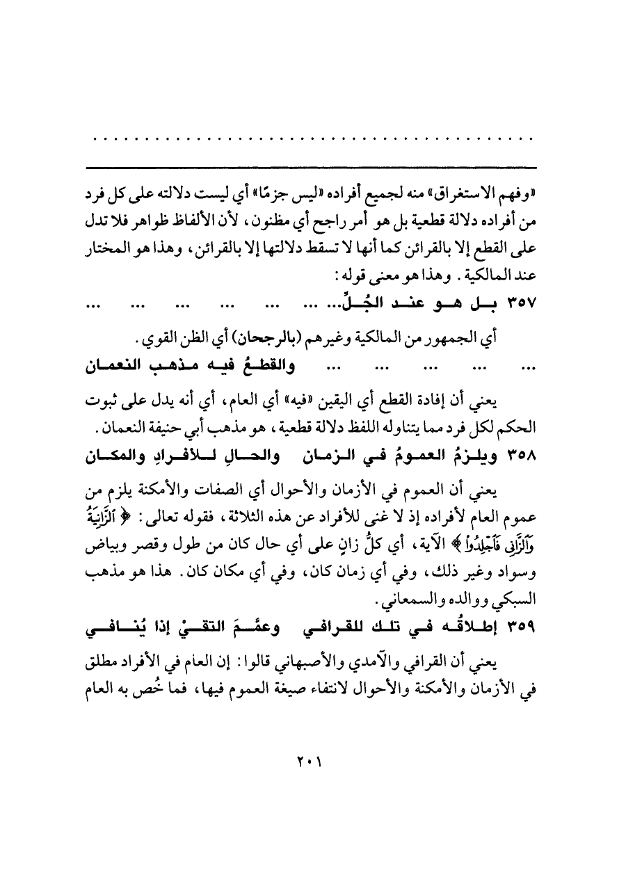 "وفهم الاستغراق" منه لجميع أفراده "ليس جزمًا" أي ليست دلالته على كل فرد من أفراده دلالة قطعية بل هو أمر راجح أي مظنون، لأن الألفاظ ظواهر فلا تدل على القطع إلا بالقرائن كما أنها لا تسقط دلالتها إلا بالقرائن، وهذا هو المختار عند المالكية. وهذا هو معنى قوله: