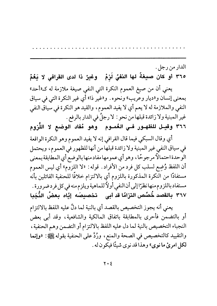 ٣٦٥ - أو كان صيغةً لها النفيُ لَزِمْ ... وغيرُ ذا لدى القرافي لا يَعُمْ