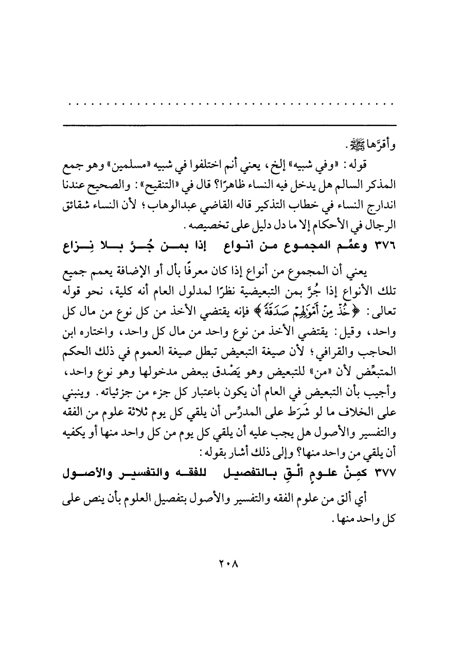 يعني أن المجموع من أنواع إذا كان معرفًا بأل أو الإضافة يعمم جميع تلك الأنواع إذا جُرَّ بمن التبعيضية نظرًا لمدلول العام أنه كلية، نحو قوله تعالى: {خُذْ مِنْ أَمْوَالِهِمْ صَدَقَةً} فإنه يقتضي الأخذ من كل نوع من مال كل واحد، وقيل: يقتضي الأخذ من نوع واحد من مال كل واحد، واختاره ابن الحاجب والقرافي؛ لأن صيغة التبعيض تبطل صيغة العموم في ذلك الحكم المتبعِّض لأن "من" للتبعيض وهو يَصْدق ببعض مدخولها وهو نوع واحد، وأجيب بأن التبعيض في العام أن يكون باعتبار كل جزء من جزئياته. وينبني على الخلاف ما لو شَرَط على المدرِّس أن يلقي كل يوم ثلاثة علوم من الفقه والتفسير والأصول هل يجب عليه أن يلقي كل يوم من كل واحد منها أو يكفيه أن يلقي من واحد منها؟ وإلى ذلك أشار بقوله: