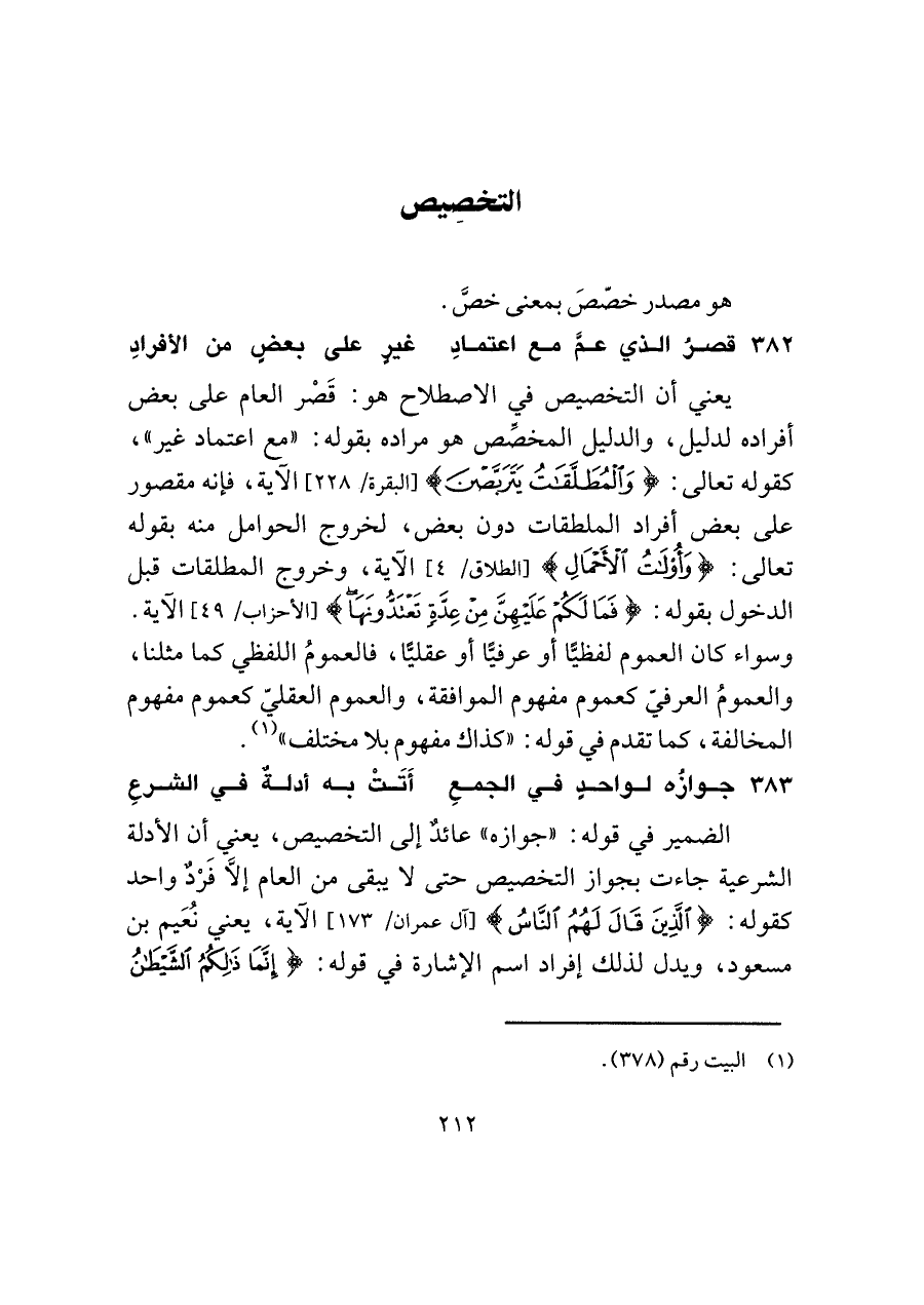 ٣٨٢ - قصرُ الذي عمَّ مع اعتمادِ ... غيرٍ على بعضٍ من الافرادِ