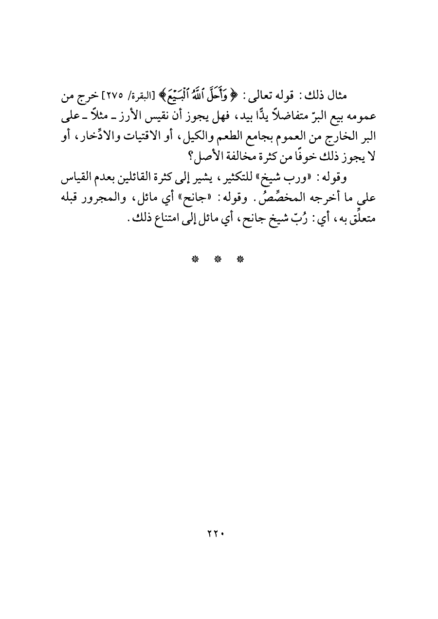 مثال ذلك: قوله تعالى: {وَأَحَلَّ اللَّهُ الْبَيْعَ} [البقرة/ ٢٧٥] خرج من عمومه بيع البرّ متفاضلًا يدًّا بيد، فهل يجوز أن نقيس الأرز -مثلًا- على البر الخارج من العموم بجامع الطعم والكيل، أو الاقتيات والادِّخار، أو لا يجوز ذلك خوفًا من كثرة مخالفة الأصل؟
