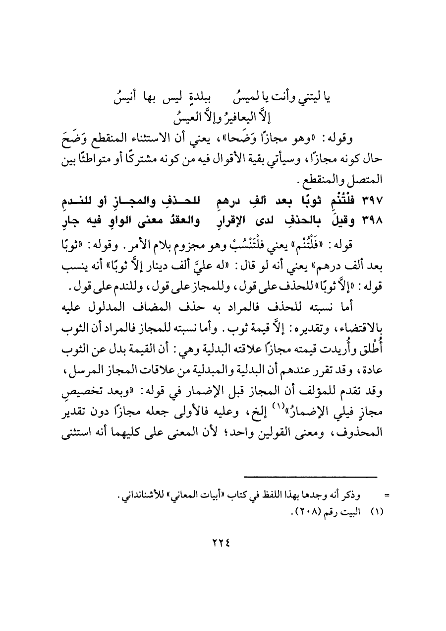 أما نسبته للحذف فالمراد به حذف المضاف المدلول عليه بالاقتضاء، وتقديره: إلَّا قيمة ثوب. وأما نسبته للمجاز فالمراد أن الثوب أُطْلق وأُريدت قيمته مجازًا علاقته البدلية وهي: أن القيمة بدل عن الثوب عادة، وقد تقرر عندهم أن البدلية والمبدلية من علاقات المجاز المرسل، وقد تقدم للمؤلف أن المجاز قبل الإضمار في قوله: "وبعد تخصيصِ مجازٍ فيلي الإضمارُ" (¬١) إلخ، وعليه فالأولى جعله مجازًا دون تقدير المحذوف، ومعنى القولين واحد؛ لأن المعنى على كليهما أنه استثنى