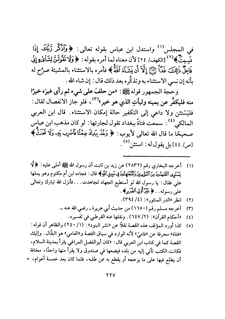 وحجة الجمهور قوله -صلى اللَّه عليه وسلم-: "من حلفَ على شيء ثم رأى غيرَه خيرًا منه فليكفِّر عن يمينه وليأتِ الذي هو خير" (¬٣)، فلو جاز الانفصال لقال: فليَسْتثن ولا داعي إلى التكفير حالة إمكان الاستثناء. قال ابن العربي المالكي (¬٤): سمعت فتاةً ببغداد تقول لجارتها: لو كان مذهب ابن عباس صحيحًا ما قال اللَّه تعالى لأيوب: {وَخُذْ بِيَدِكَ ضِغْثًا فَاضْرِبْ بِهِ وَلَا تَحْنَثْ} [ص/ ٤٤] بل يقول له: استثن (¬٥).