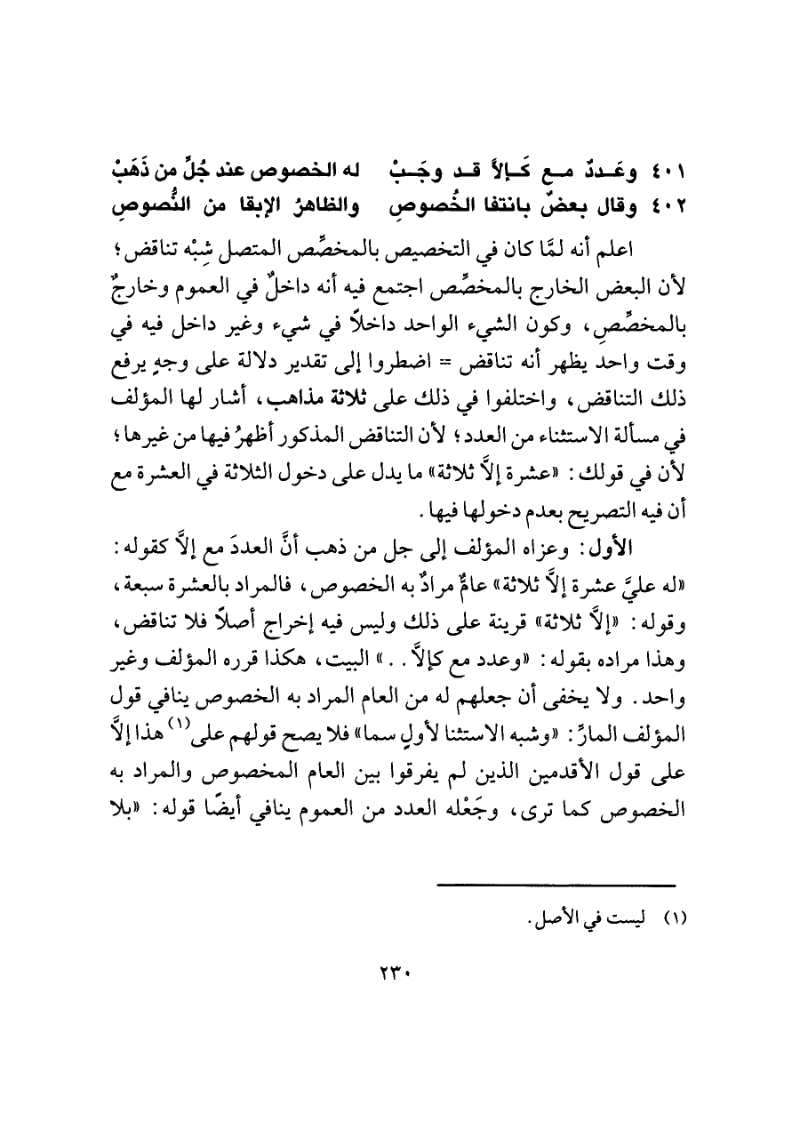 ٤٠١ - وعَددٌ مع كَإلَّا قد وجَبْ ... له الخصوص عند جُلِّ من ذَهَبْ