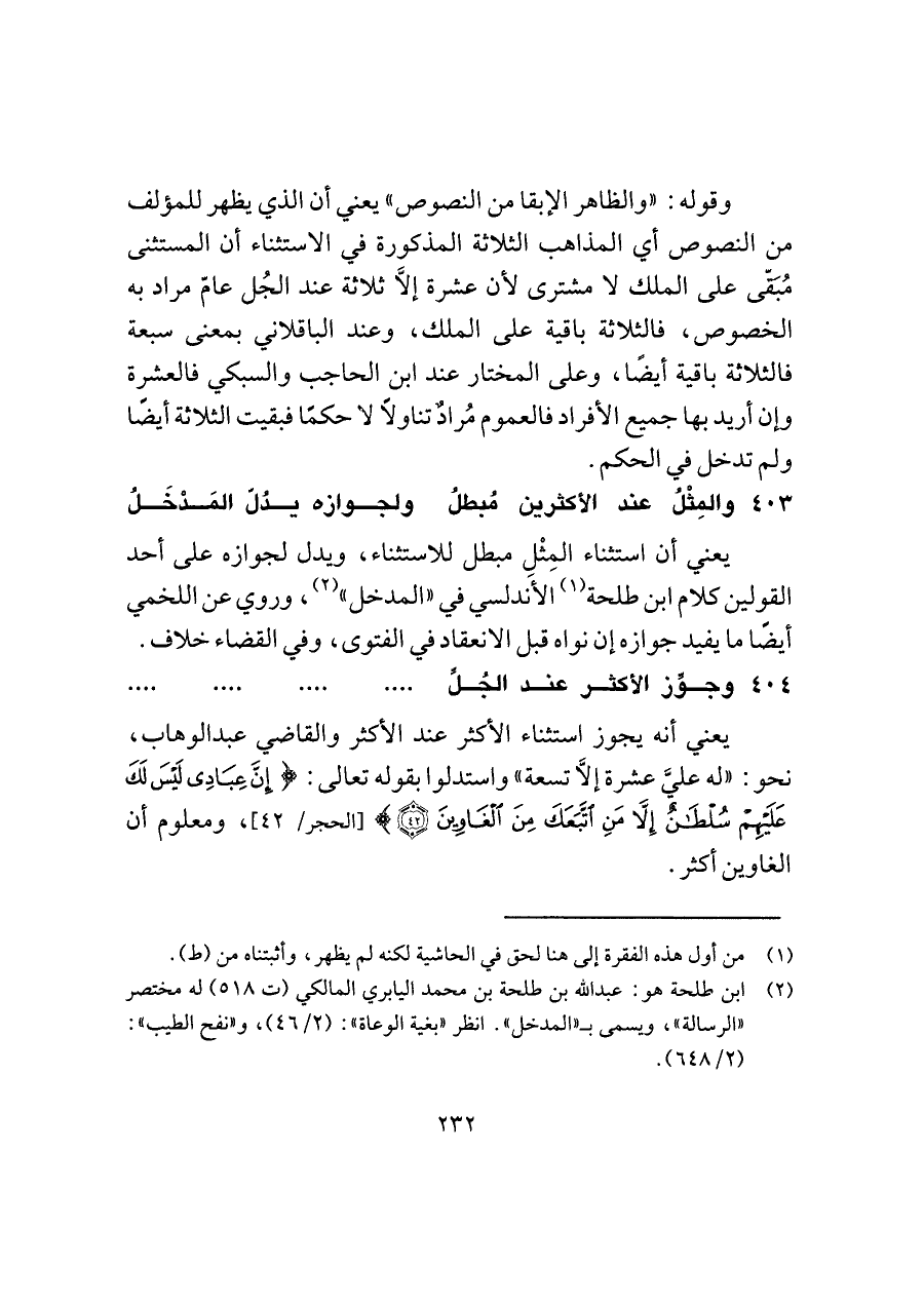 يعني أنه يجوز استثناء الأكثر عند الأكثر والقاضي عبد الوهاب، نحو: "له عليَّ عشرة إلَّا تسعة" واستدلوا بقوله تعالى: {إِنَّ عِبَادِي لَيْسَ لَكَ عَلَيْهِمْ سُلْطَانٌ إِلَّا مَنِ اتَّبَعَكَ مِنَ الْغَاوِينَ (٤٢)} [الحجر/ ٤٢]، ومعلوم أن الغاوين أكثر.