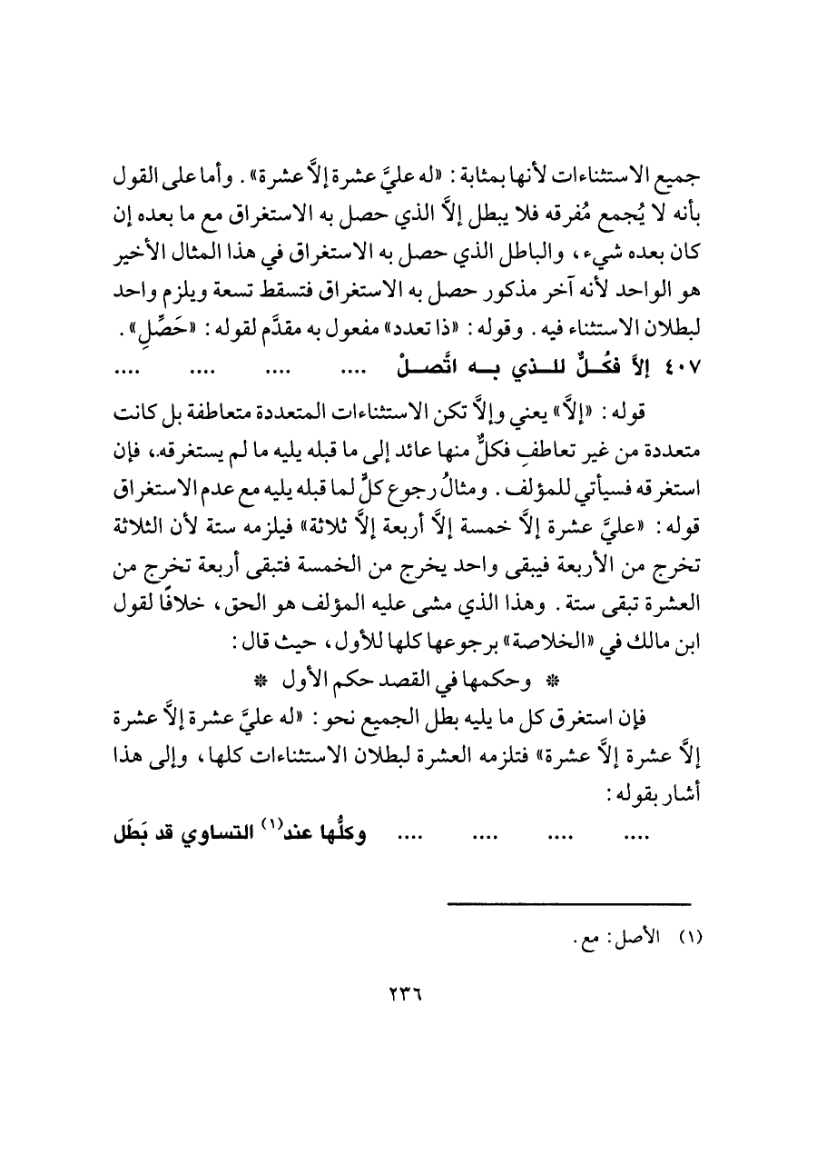جميع الاستثناءات لأنها بمثابة: "له عليَّ عشرة إلَّا عشرة". وأما على القول بأنه لا يُجمع مُفرقه فلا يبطل إلَّا الذي حصل به الاستغراق مع ما بعده إن كان بعده شيء، والباطل الذي حصل به الاستغراق في هذا المثال الأخير هو الواحد لأنه آخر مذكور حصل به الاستغراق فتسقط تسعة ويلزم واحد لبطلان الاستثناء فيه. وقوله: "ذا تعدد" مفعول به مقدَّم لقوله: "حَصِّلِ".