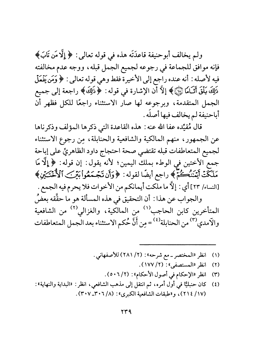 ولم يخالف أبو حنيفة قاعدَتَه هذه في قوله تعالى: {إِلَّا مَنْ تَابَ} فإنه موافق للجماعة في رجوعه لجميع الجمل قبله، ووجه عدم مخالفته فيه لأصله: أنه عنده راجع إلى الأخيرة فقط وهي قوله تعالى: {وَمَنْ يَفْعَلْ ذَلِكَ يَلْقَ أَثَامًا (٦٨)} إلَّا أن الإشارة في قوله: {ذَلِكَ} راجعة إلى جميع الجمل المتقدمة، وبرجوعه لها صار الاستثناء راجعًا للكل فظهر أن أبا حنيفة لم يخالف فيها أصلَه.