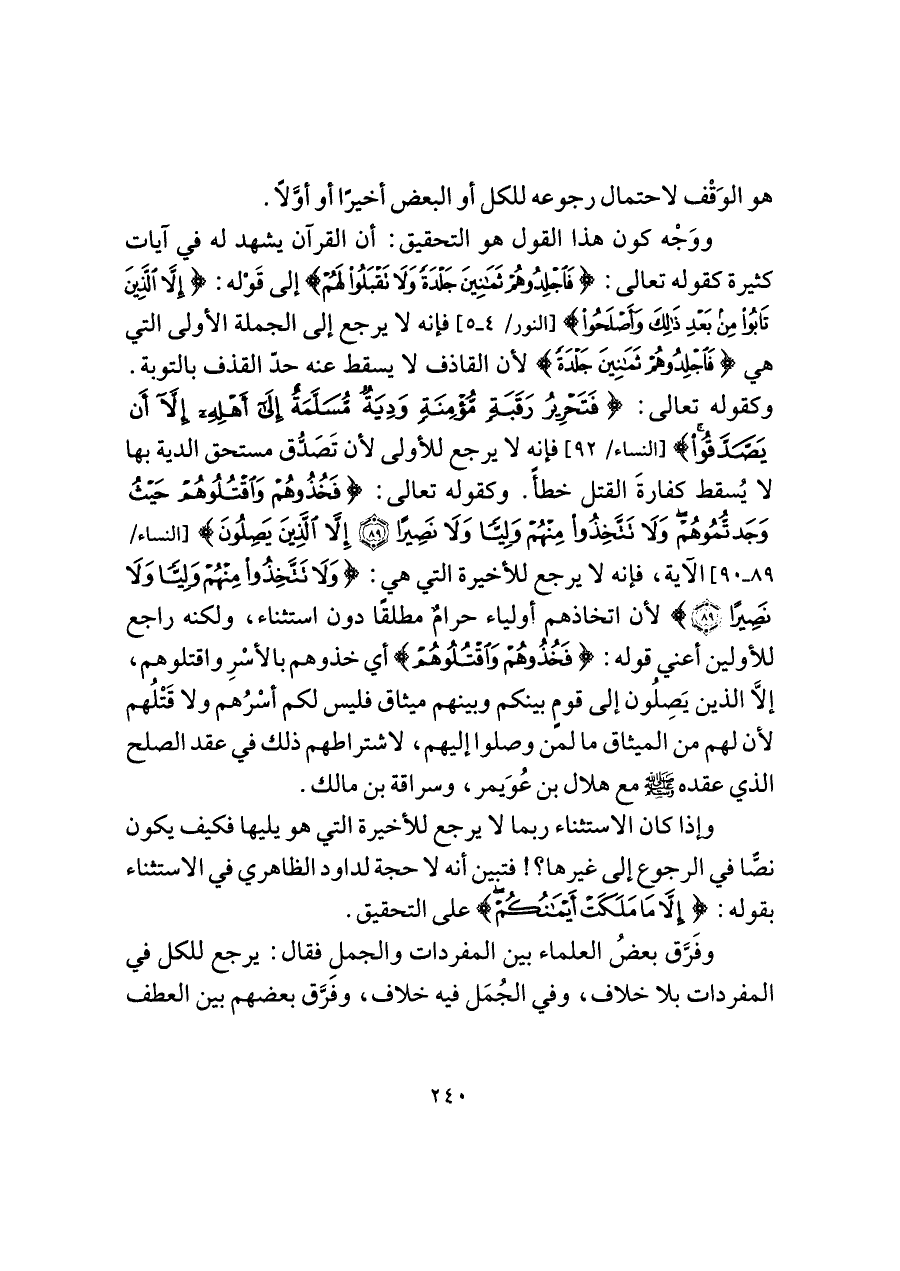 ووَجْه كون هذا القول هو التحقيق: أن القرآن يشهد له في آيات كثيرة كقوله تعالى: {فَاجْلِدُوهُمْ ثَمَانِينَ جَلْدَةً وَلَا تَقْبَلُوا لَهُمْ} إلى قَوْله: {إِلَّا الَّذِينَ تَابُوا مِنْ بَعْدِ ذَلِكَ وَأَصْلَحُوا} [النور/ ٤ - ٥] فإنه لا يرجع إلى الجملة الأولى التي هي {فَاجْلِدُوهُمْ ثَمَانِينَ جَلْدَةً} لأن القاذف لا يسقط عنه حدّ القذف بالتوبة. وكقوله تعالى: {فَتَحْرِيرُ رَقَبَةٍ مُؤْمِنَةٍ وَدِيَةٌ مُسَلَّمَةٌ إِلَى أَهْلِهِ إِلَّا أَنْ يَصَّدَّقُوا} [النساء/ ٩٢] فإنه لا يرجع للأولى لأن تَصَدُّق مستحق الدية بها لا يُسقط كفارةَ القتل خطأً. وكقوله تعالى: {فَخُذُوهُمْ وَاقْتُلُوهُمْ حَيْثُ وَجَدْتُمُوهُمْ وَلَا تَتَّخِذُوا مِنْهُمْ وَلِيًّا وَلَا نَصِيرًا (٨٩) إِلَّا الَّذِينَ يَصِلُونَ} [النساء/ ٨٩ - ٩٠] الآية، فإنه لا يرجع للأخيرة التي هي: {وَلَا تَتَّخِذُوا مِنْهُمْ وَلِيًّا وَلَا نَصِيرًا (٨٩)} لأن اتخاذهم أولياء حرامٌ مطلقًا دون استثناء، ولكنه راجع للأولين أعني قوله: {فَخُذُوهُمْ وَاقْتُلُوهُمْ} أي خذوهم بالأسْرِ واقتلوهم، إلَّا الذين يَصِلُون إلى قومٍ بينكم وبينهم ميثاق فليس لكم أسْرُهم ولا قَتْلُهم لأن لهم من الميثاق ما لمن وصلوا إليهم، لاشتراطهم ذلك في عقد الصلح الذي عقده -صلى اللَّه عليه وسلم- مع هلال بن عُوَيمر، وسراقة بن مالك.