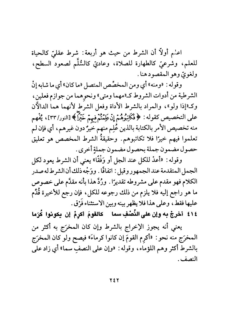 وقوله: "ومنه" أي ومن المخصِّص المتصل "ما كان" أي ما شابه إنْ الشرطية من أدوات الشروط كـ "مهما ومتى" ونحوِهما من جوازم فعلين، وكـ "إذا ولو"، والمراد بالشرط الأداة وفعل الشرط لأنهما هما الدالَّان على التخصيص كقوله: {فَكَاتِبُوهُمْ إِنْ عَلِمْتُمْ فِيهِمْ خَيْرًا} [النور/ ٣٣]، يُفْهم منه تخصيص الأمر بالكتابة بالذين عُلِم منهم خيرٌ دون غيرهم، أي فإن لم تعلموا فيهم خيرًا فلا تكاتبوهم، وحقيقةُ الشرط المخصص هو تعليق حصول مضمون جملة بحصول مضمون جملةٍ أخرى.
