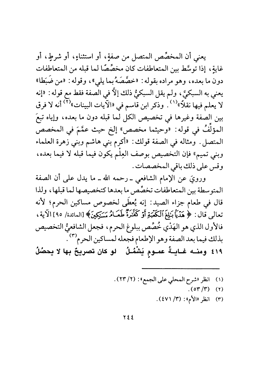 وروى عن الإمام الشافعي -رحمه اللَّه- ما يدل على أن الصفة المتوسطة بين المتعاطفات تخصِّص ما بعدها كتخصيصها لما قبلها، ولذا قال في طعام جزاء الصيد: إنه يُعطَى لخصوص مساكين الحرم؛ لأنه تعالى قال: {هَدْيًا بَالِغَ الْكَعْبَةِ أَوْ كَفَّارَةٌ طَعَامُ مَسَاكِينَ} [المائدة/ ٩٥] الآية، فالأول الذي هو الهَدْي خُصِّص ببلوغ الحرم، فجعل الشافعيُّ التخصيص بذلك فيما بعد الصفة وهو الإطعام فجعله لمساكين الحرم (¬٣).