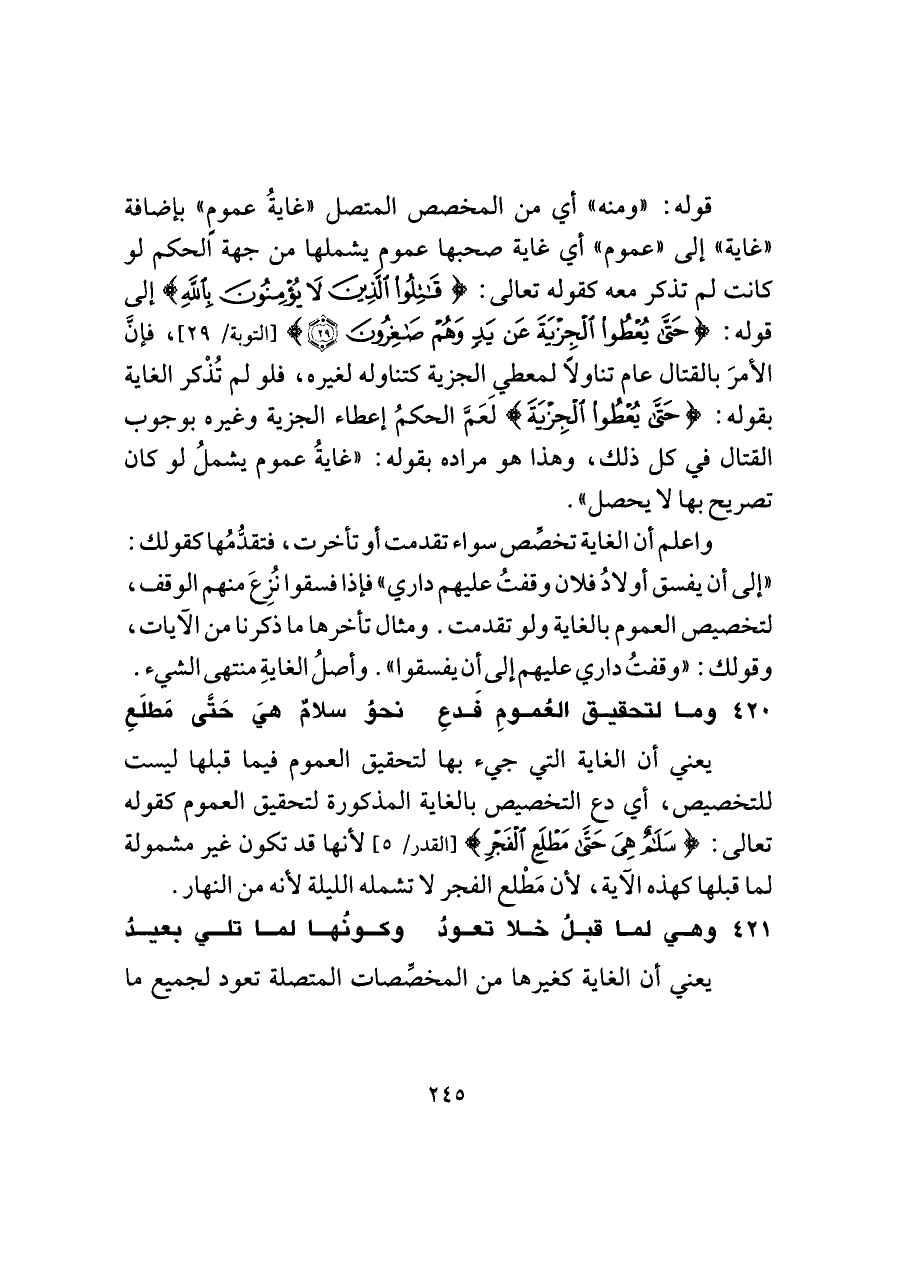قوله: "ومنه" أي من المخصص المتصل "غايةُ عمومٍ" بإضافة "غاية" إلى "عموم" أي غاية صحبها عموم يشملها من جهة الحكم لو كانت لم تذكر معه كقوله تعالى: {قَاتِلُوا الَّذِينَ لَا يُؤْمِنُونَ بِاللَّهِ} إلى قوله: {حَتَّى يُعْطُوا الْجِزْيَةَ عَنْ يَدٍ وَهُمْ صَاغِرُونَ (٢٩)} [التوبة/ ٢٩] فإنَّ الأمرَ بالقتال عام تناولًا لمعطي الجزية كتناوله لغيره، فلو لم تُذْكر الغاية بقوله: {حَتَّى يُعْطُوا الْجِزْيَةَ} لَعَمَّ الحكمُ إعطاء الجزية وغيره بوجوب القتال في كل ذلك، وهذا هو مراده بقوله: "غايةُ عموم يشملُ لو كان تصريح بها لا يحصل".