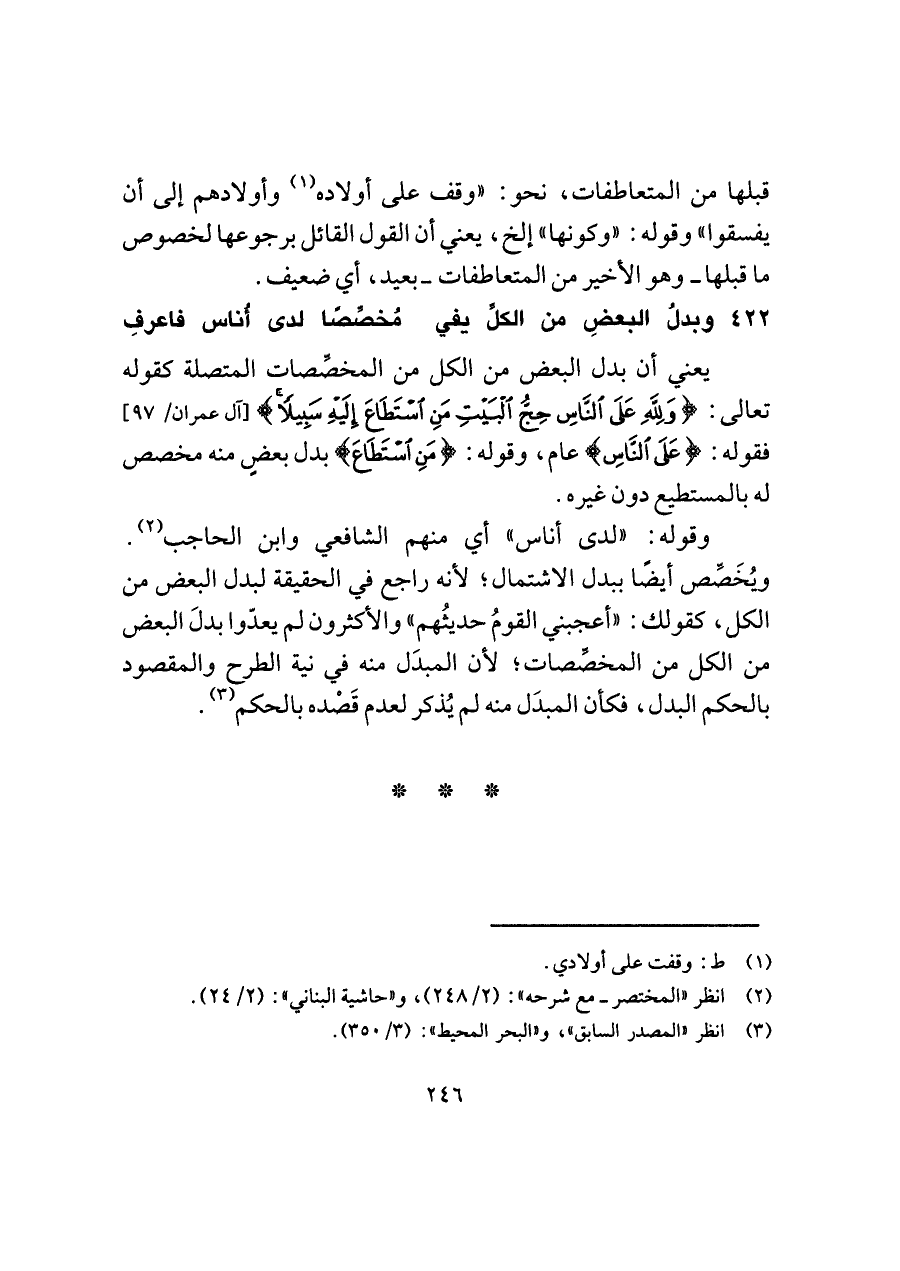 وقوله: "لدى أناس" أي منهم الشافعي وابن الحاجب (¬٢). ويُخَصِّص أيضًا ببدل الاشتمال؛ لأنه راجع في الحقيقة لبدل البعض من الكل، كقولك: "أعجبني القومُ حديثُهم" والأكثرون لم يعدّوا بدلَ البعض من الكل من المخصِّصات، لأن المبدَل مثه في نية الطرح والمقصود بالحكم البدل، فكأن المبدَل منه لم يُذكر لعدم قَصْده بالحكم (¬٣).
