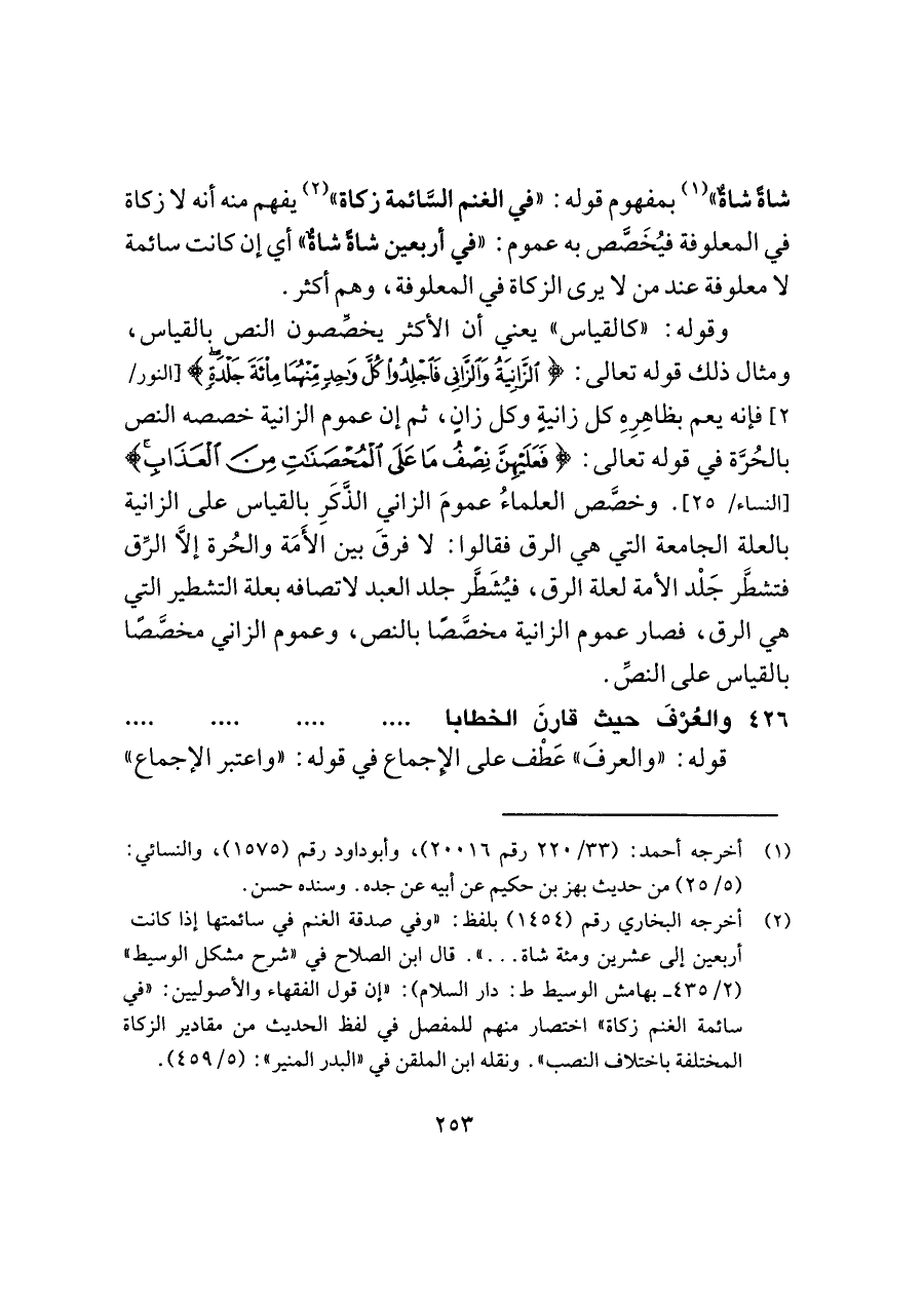 (¬٢) أخرجه البخاري رقم (١٤٥٤) بلفظ: "وفي صدقة الغنم في سائمتها إذا كانت أربعين إلى عشرين ومئة شاة. . . ". قال ابن الصلاح في "شرح مشكل الوسيط" (٢/ ٤٣٥ - بهامش الوسيط ط: دار السلام): "إن قول الفقهاء والأصوليين: "في سائمة الغنم زكاة" اختصار منهم للمفصل في لفظ الحديث من مقادير الزكاة المختلفة باختلاف النصب". ونقله ابن الملقن في "البدر المنير": (٥/ ٤٥٩).
