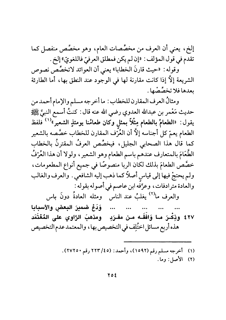 ومثالُ العرف المقارن للخطاب: ما أخرجه مسلم والإمام أحمد من حديث مَعْمر بن عبد اللَّه العدوي رضي اللَّه عنه قال: كنتُ أسمع النبيَّ -صلى اللَّه عليه وسلم- يقول: "الطعامُ بالطعام مِثْلًا بمثلٍ وكان طعامُنا يومئذٍ الشعير" (¬١) فلفظ الطعام يعمّ كل أجناسه إلَّا أن العُرْف المقارن للخطاب خصَّصه بالشعير كما قال هذا الصحابي الجليل، فيخصِّص العرفُ المقترنُ بالخطاب الطعَامَ بالمتعارف عندهم باسم الطعام وهو الشعير، ولولا أن هذا العُرْفُ خصَّص الطعامَ بذلك لكان الربا منصوصًا في جميع أنواع المطعومات، ولم يحتجْ فيها إلى قياسٍ أصلًا كما ذهب إليه الشافعي. والعرف والغالب والعادة مترادفات، وعرَّفه ابن عاصم في أصوله بقوله: