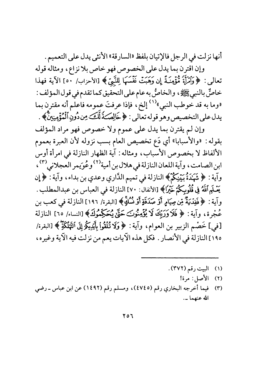 وإن لم يقترن بما يدل على عموم ولا خصوص فهو مراد المؤلف بقوله: "والأسبابا" أي دعَ تخصيص العام بسب نزوله لأن العبرة بعموم الألفاظ لا بخصوص الأسباب، ومثاله: آية الظهار النازلة في امرأة أوس ابن الصامت، وآية اللعان النازلة في هلال بن أمية (¬٢) وعُوَيمر العجلاني (¬٣)، وآية: {شَهَادَةُ بَيْنِكُمْ} النازلة في تميم الدَّاري وعدي بن بداء، وآية: {إِنْ يَعْلَمِ اللَّهُ فِي قُلُوبِكُمْ خَيْرًا} [الأنفال/ ٧٠] النازلة في العباس بن عبد المطلب. وآية: {فَفِدْيَةٌ مِنْ صِيَامٍ أَوْ صَدَقَةٍ أَوْ نُسُكٍ} [البقرة/ ١٩٦] النازلة في كعب بن عُجْرة، وآية: {فَلَا وَرَبِّكَ لَا يُؤْمِنُونَ حَتَّى يُحَكِّمُوكَ} [النساء/ ٦٥] النازلة [في] خَصْم الزبير بن العوام، وآية: {وَلَا تُلْقُوا بِأَيْدِيكُمْ إِلَى التَّهْلُكَةِ} [البقرة/ ١٩٥] النازلة في الأنصار. فكل هذه الآيات يعم من نزلت فيه الآية وغيره،