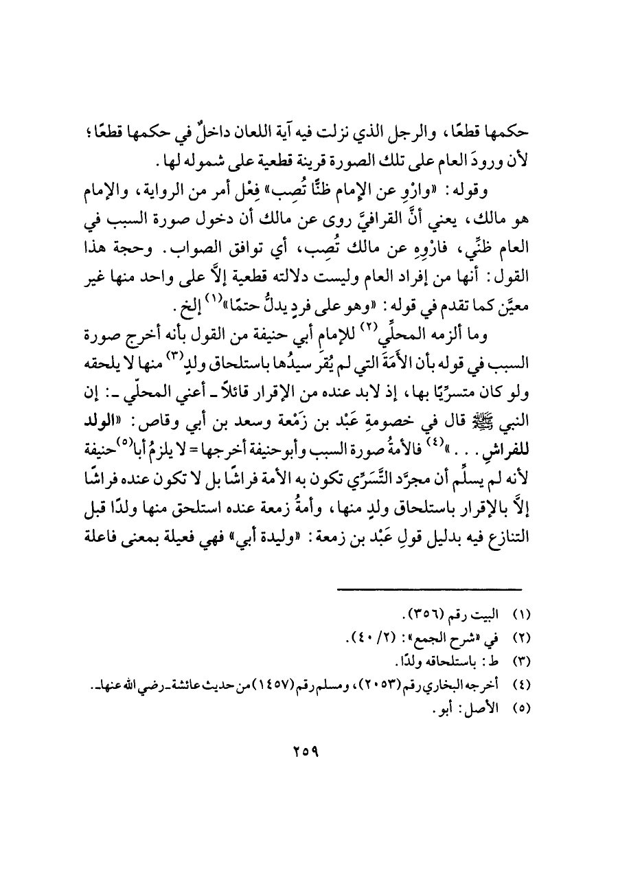 وما ألزمه المحلِّي (¬٢) للإمامِ أبي حنيفة من القول بأنه أخرج صورة السبب في قوله بأن الأَمَةَ التي لم يُقر سيدُها باستلحاق ولدٍ (¬٣) منها لا يلحقه ولو كان متسرِّيًا بها، إذ لابد عنده من الإقرار قائلًا -أعني المحلّي-: إن النبي -صلى اللَّه عليه وسلم- قال في خصومةِ عَبْد بن زَمْعة وسعد بن أبي وقاص: "الولد للفراشِ. . . " (¬٤) فالأمةُ صورة السبب وأبو حنيفة أخرجها = لا يلزمُ أبا (¬٥) حنيفة لأنه لم يسلِّم أن مجرَّد التَّسَرِّي تكون به الأمة فراشًا بل لا تكون عنده فراشًا إلَّا بالإقرار باستلحاق ولدٍ منها، وأمةُ زمعة عنده استلحق منها ولدًا قبل التنازع فيه بدليل قولِ عَبْد بن زمعة: "وليدة أبي" فهي فعيلة بمعنى فاعلة